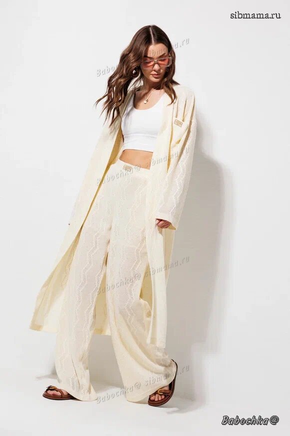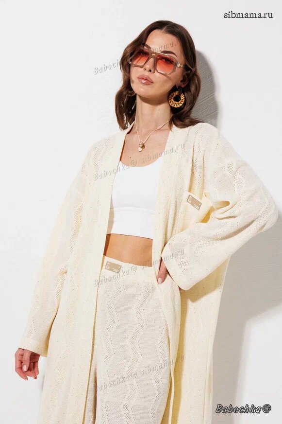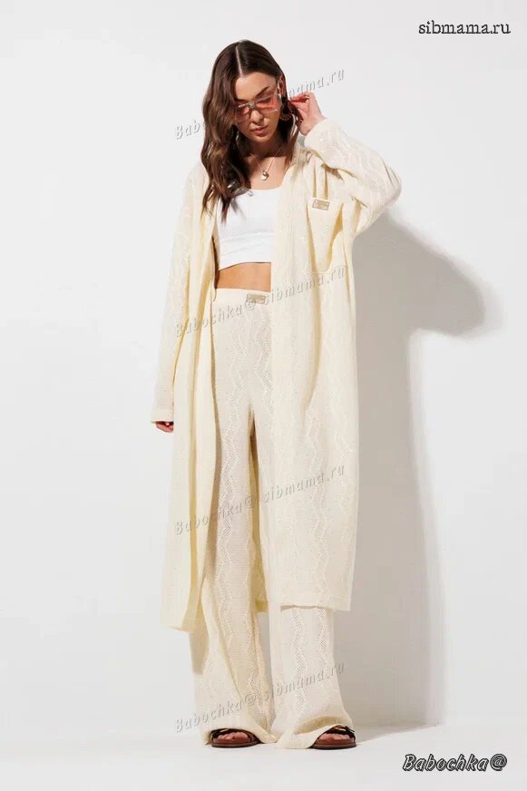 "Стильный комплект из удлиненного кардигана и брюк-палаццо из трикотажного полотна с дизайном. Кардиган свободного прямого силуэта со спущенной линией плеча. На переде накладной карман с декоративной нашивкой.