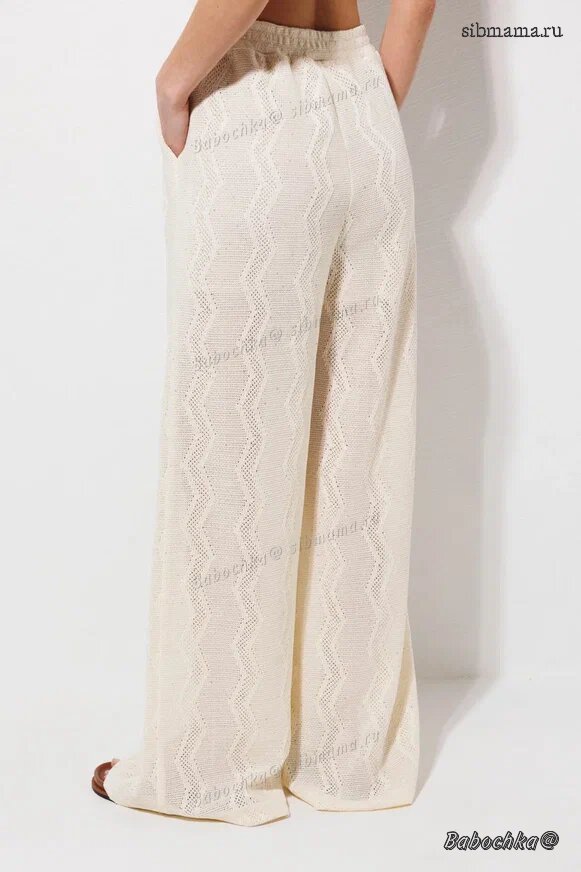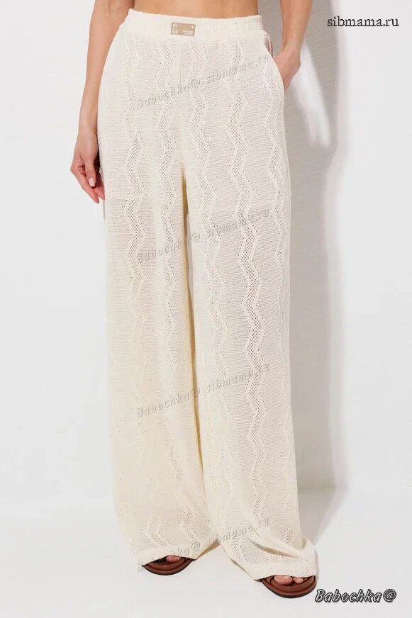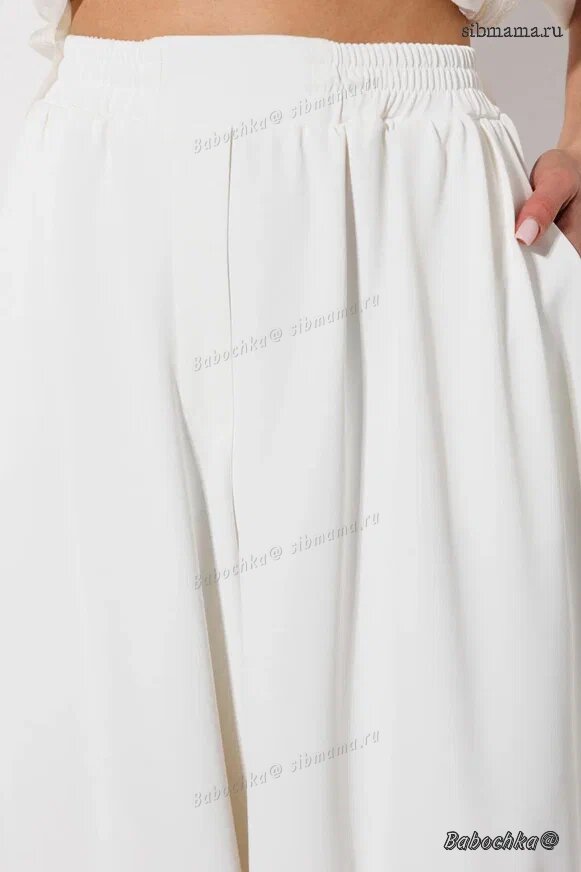 Брюки-палаццо свободного силуэта, расширенные к низу. Пояс притачной с частичной сборкой на эластичную тесьму и декоративной нашивкой по центру. Передние половинки с боковыми карманами с наклонным входом. Брюки на укороченной подкладке.