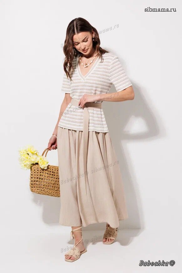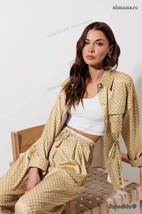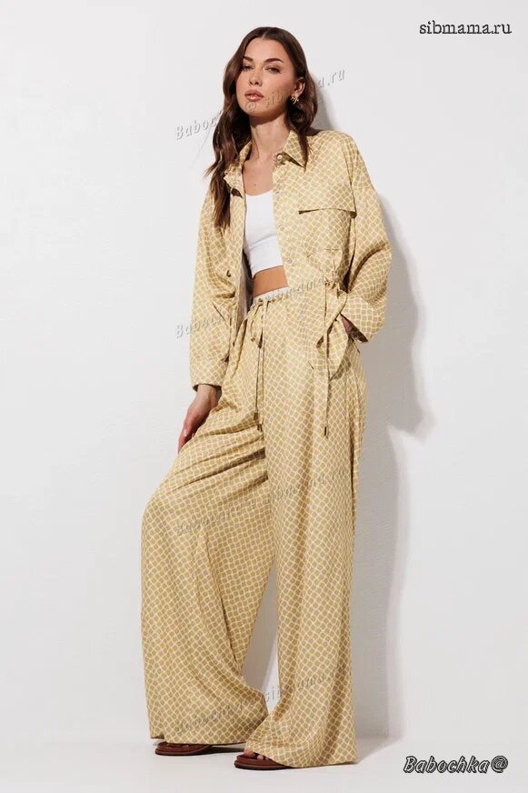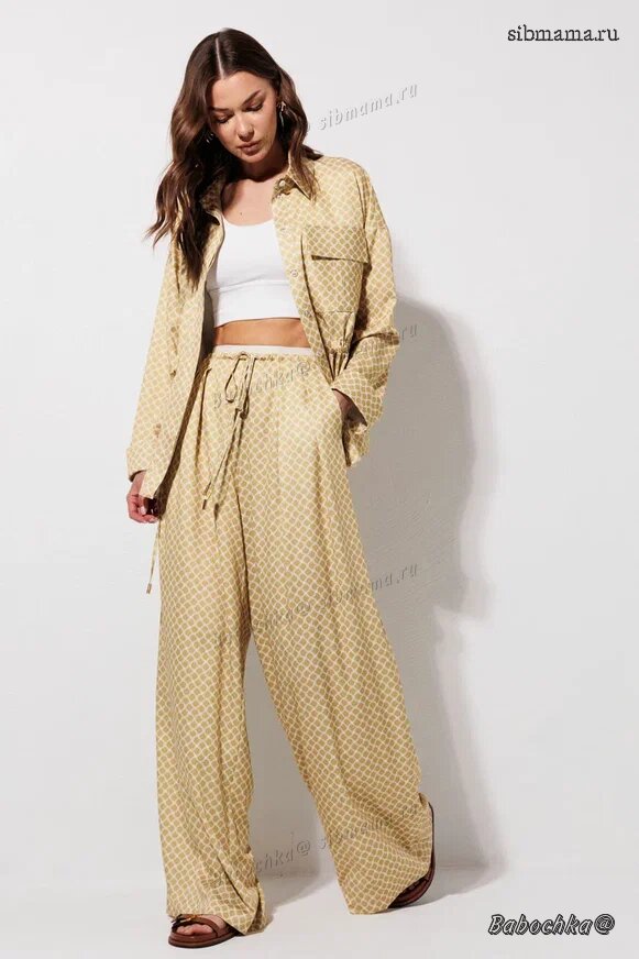 Стильный комплект из джемпера и брюк-палаццо из трикотажного полотна с дизайном. Ассиметричный джемпер полуприлегающего силуэта из трикотажного полотна с дизайном. Горловина-лодочка. Рукав цельнокроеный. Брюки свободного силуэта, расширенные к низу из трикотажного полотна с дизайном. Пояс притачной с частичной эластичной тесьмой и декоративной нашивкой по центру. Передние половинки с боковыми карманами с наклонным входом. Брюки на укороченной подкладке. Обращаем ваше внимание, что фурнитура может отличаться от фото.