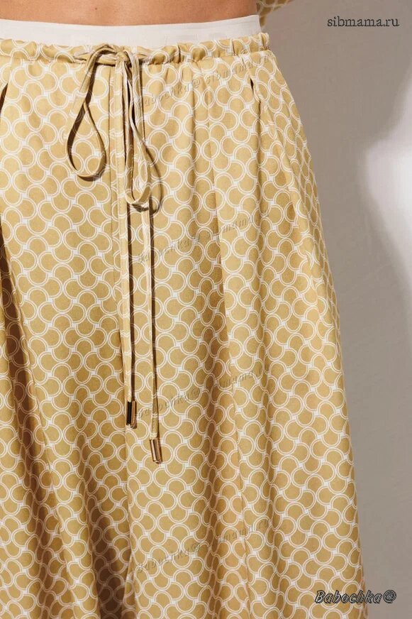 Брюки прямого силуэта из струящейся ткани. По верху притачная декоративная резинка и декоративная кулиса с завязками. По переду предусмотрены декоративные складки и наклонные карманы.