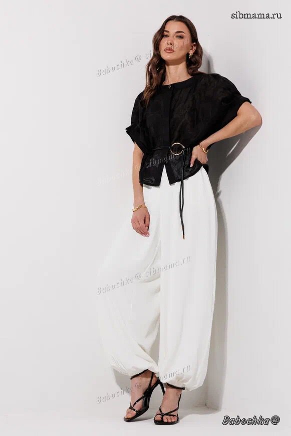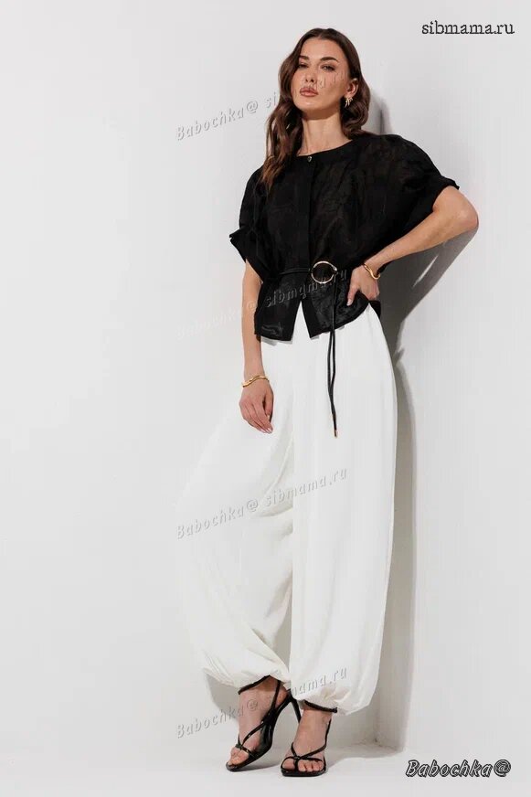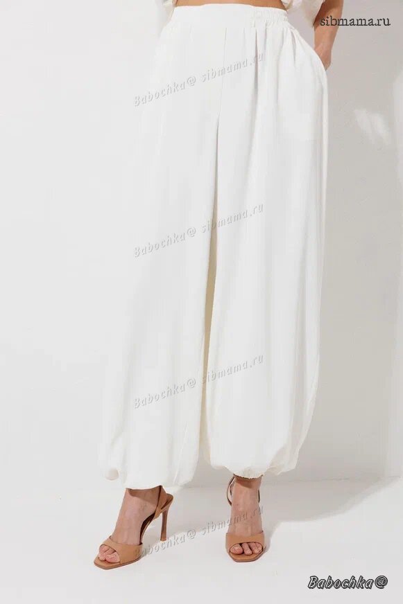 Трендовые брюки «алладины» из струящейся ткани. По верху брюк притачной пояс на эластичной тесьме (резинке). По низу брюк узкая притачная планка с эластичной тесьмой. По переду боковые карманы с наклонным входом.