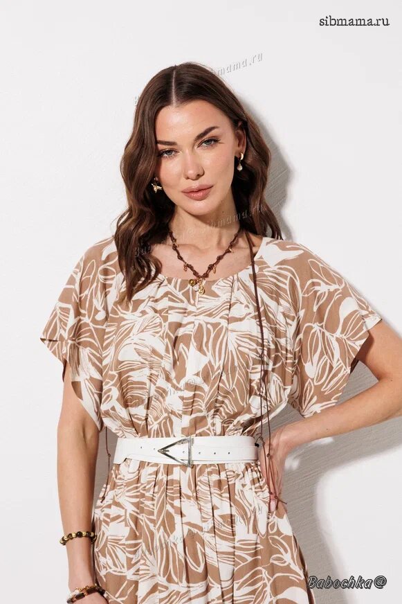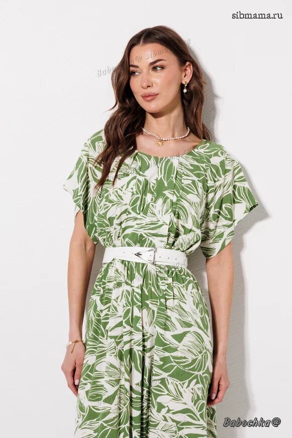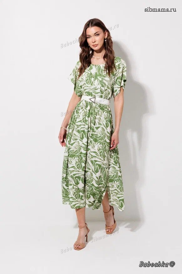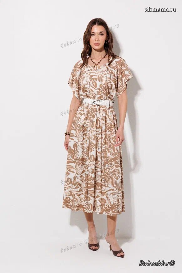 Платье полуприлегающего силуэта из штапельной ткани с дизайном. Горловина округлая, по центру застежка на молнию. Рукав покроя реглан. Платье отрезное по линии талии, в подрез вставлена эластичная тесьма(резинка). На лифе переда и спинки декоративные складки. В боковом шве потайная молния. По низу платья в боковом шве разрезы. В комплект входит ремень.