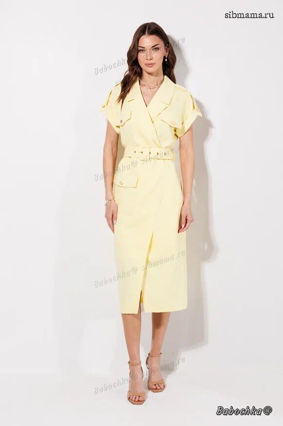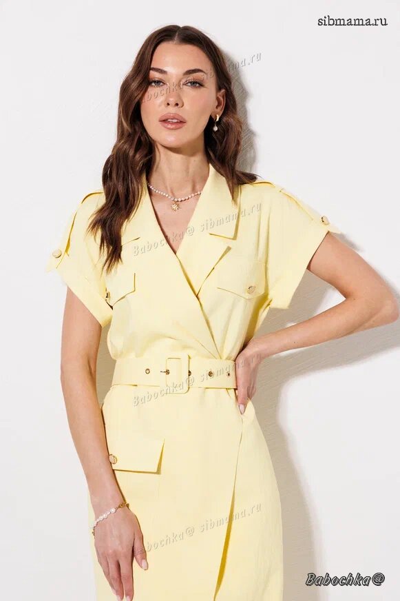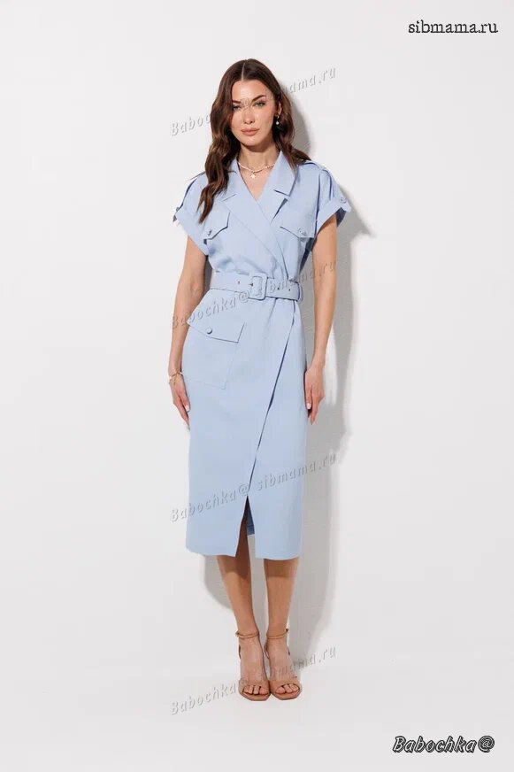 Платье полуприлегающего силуэта из плательной ткани. Воротник пиджачного типа с двубортной застежкой. Рукав цельнокроеный, по низу манжета с декоративной патой. Платье отрезное по линии талии, в подрез вставлена эластичная тесьма (резинка). Лиф платья на запах. На лифе переда декоративные клапаны. Юбка по переду на запах, с дополнительной подкладкой из основной ткани. В комплект входит ремень. Обращаем ваше внимание, что фурнитура может отличаться от фото.