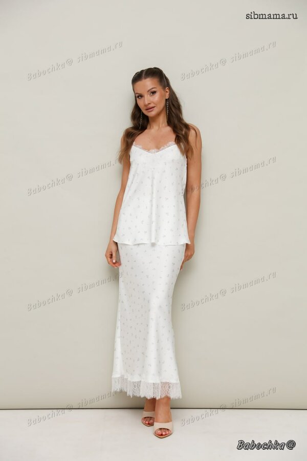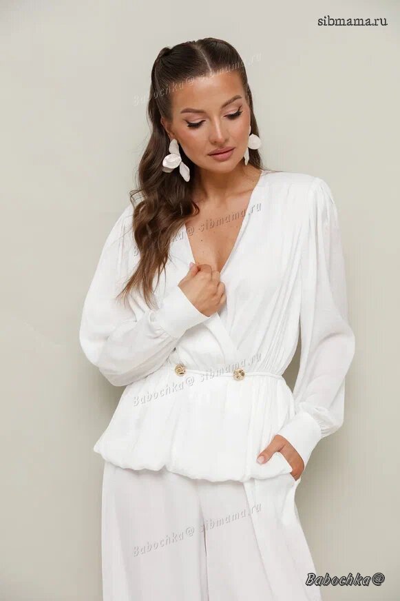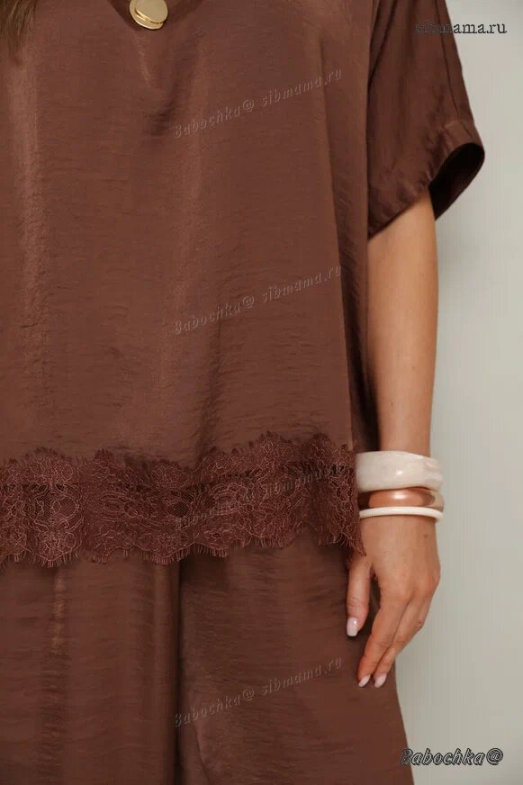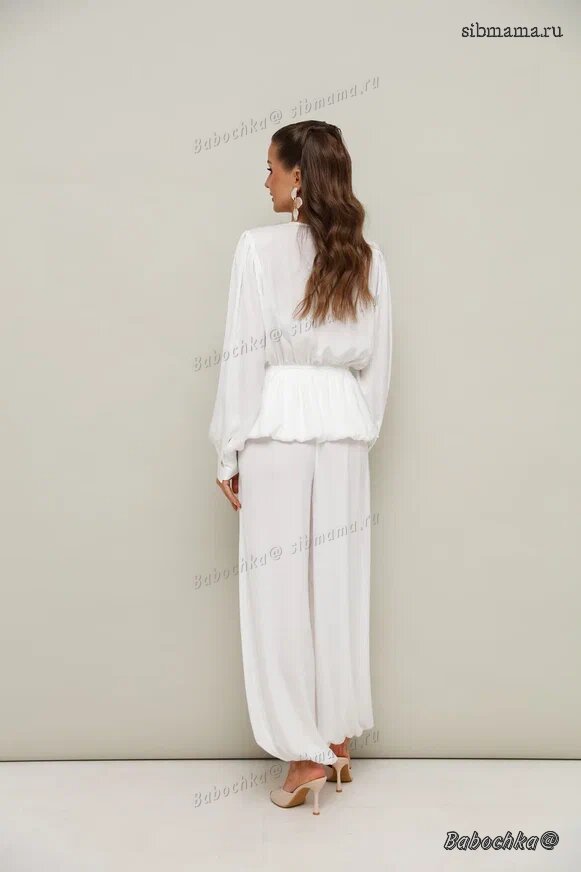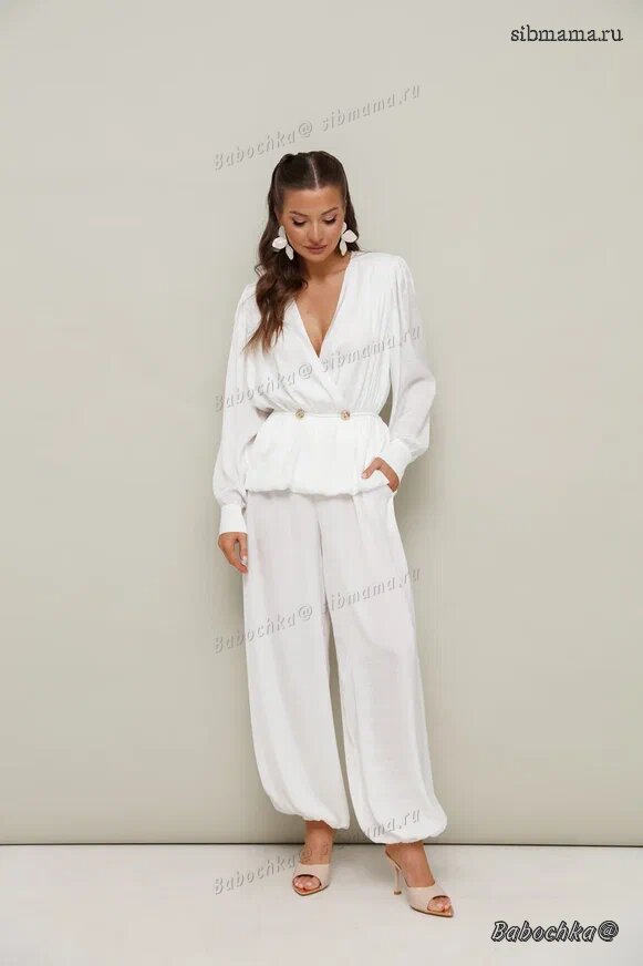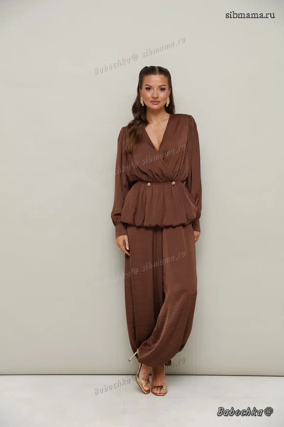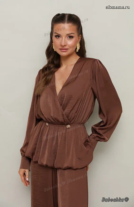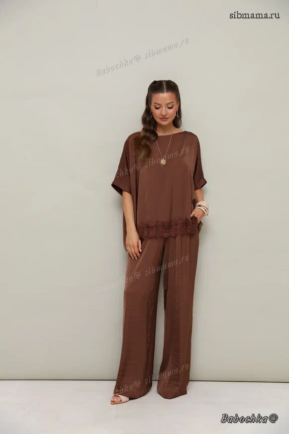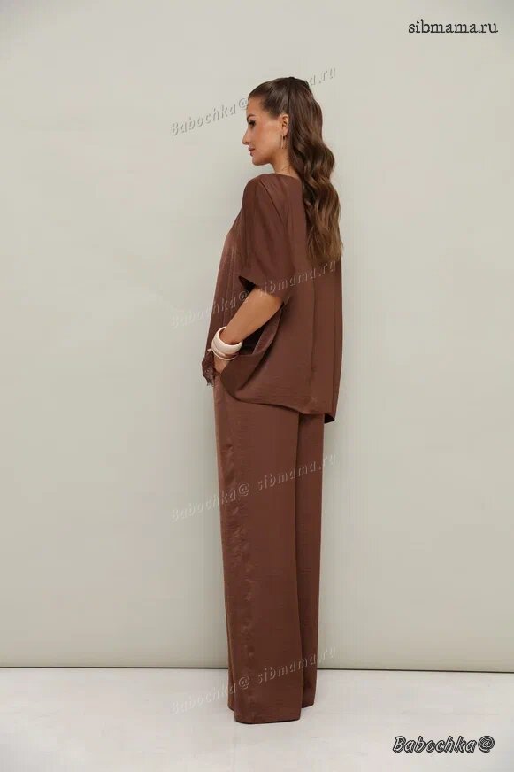 "Женский комплект, состоящий из блузки и брюк, выполнен из струящейся ткани с благородным матовым блеском.