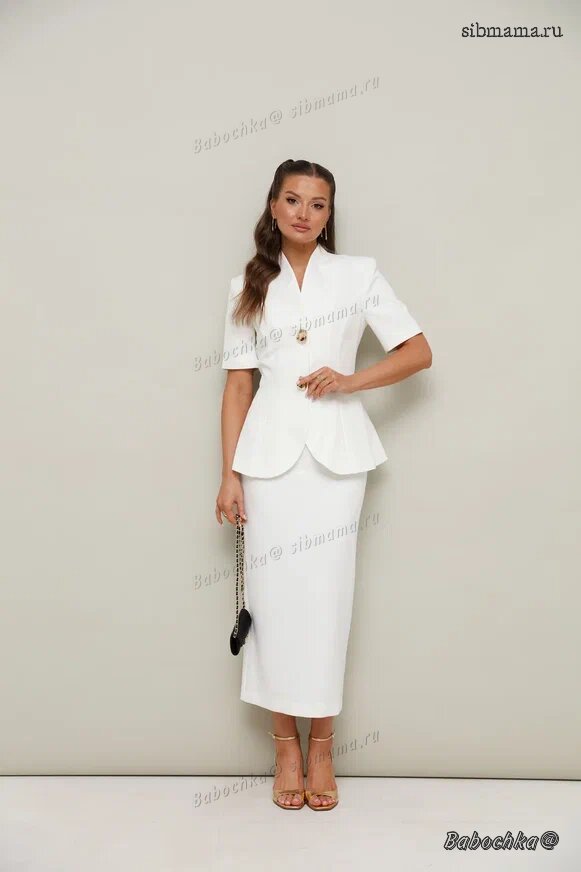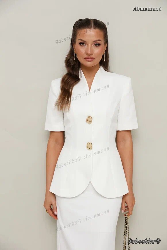 "Жакет полуприлегающего силуэта, слегка расширенный к низу. Горловина с цельнокроеной стойкой и V-образным вырезом. Центральная застёжка на потайные пришивные кнопки с декоративными акцентными пуговицами. Рукава короткие втачные, двухшовные. Спинка с рельефами и средним швом.