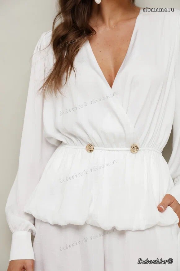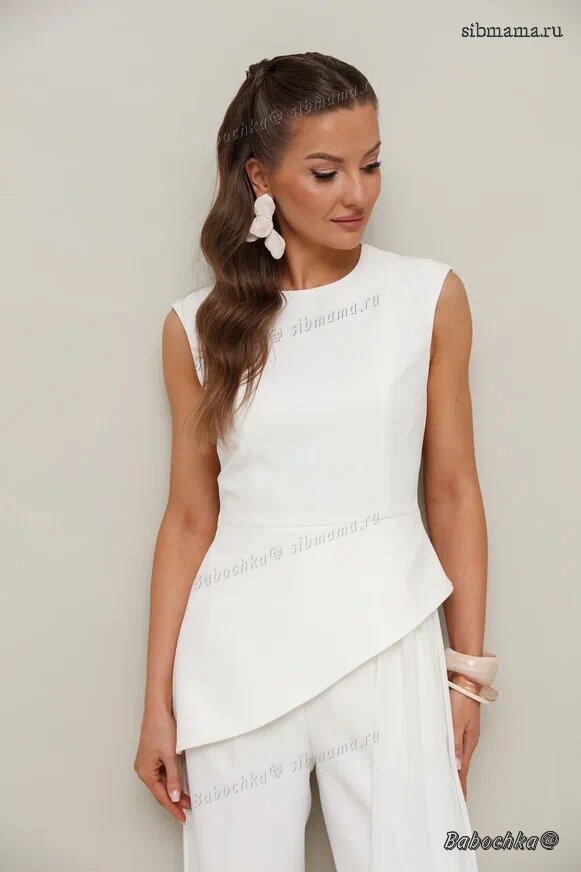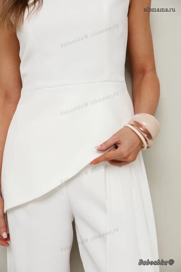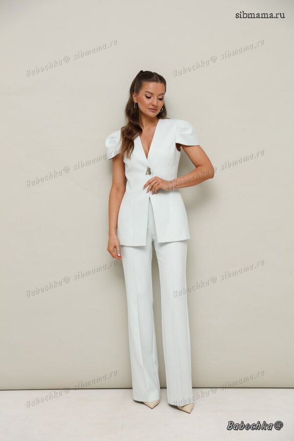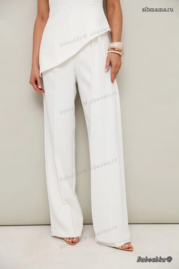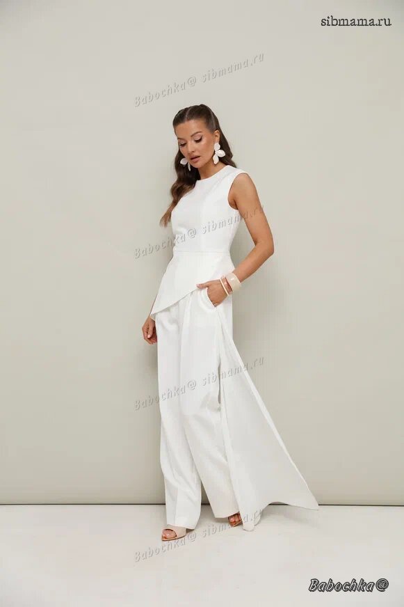 "Стильный 2-предметный комплект, состоящий из блузки со съемным шлейфом и брюк. Блузка и брюки выполнены из костюмной ткани, шлейф - из крэш-шифона.