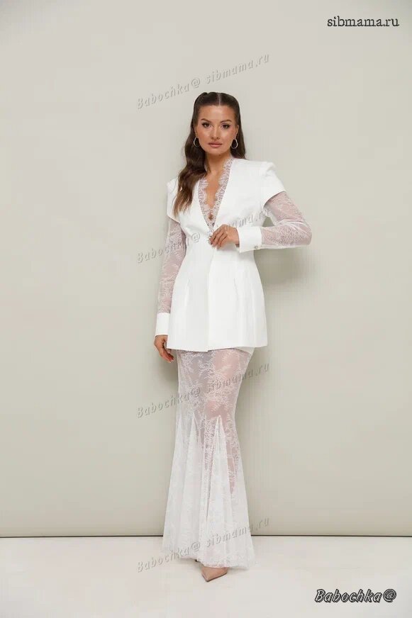 "Силуэтный жакет полуприлегающего кроя с имитацией жилета, выполнен из костюмной ткани и изысканного французского кружевного полотна. Горловина с V-образным вырезом, декорированная кружевной отделкой. Центральная застежка на петлю и пуговицу. Спереди обработаны рельефы, переходящие складки.