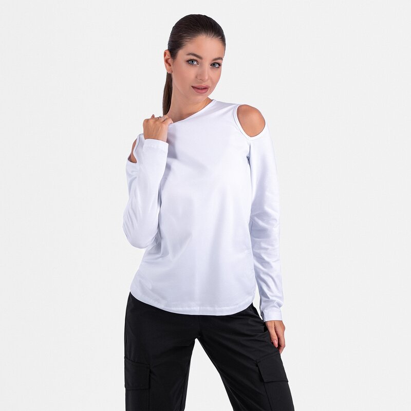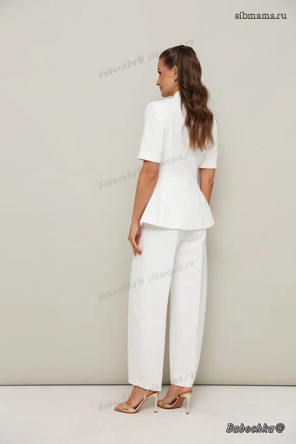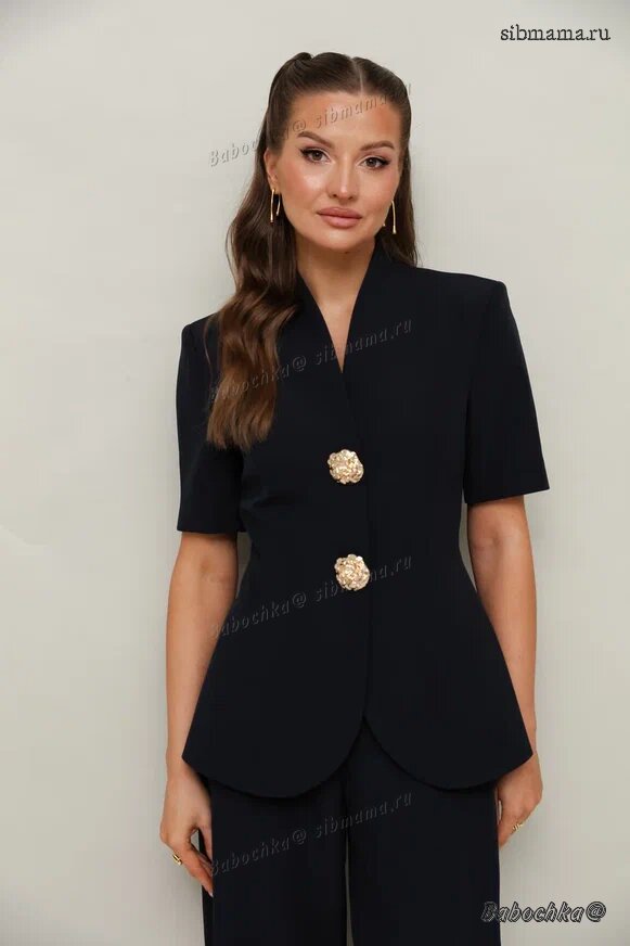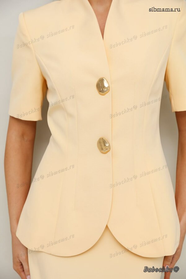 Жакет полуприлегающего силуэта, слегка расширенный к низу. Горловина с цельнокроеной стойкой и V-образным вырезом. Центральная застёжка на потайные пришивные кнопки с декоративными акцентными пуговицами. Рукава короткие втачные, двухшовные. Спинка с рельефами и средним швом.
