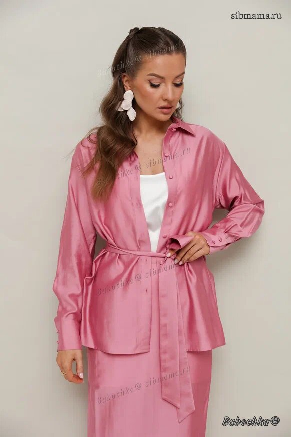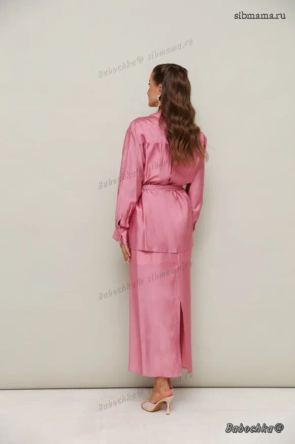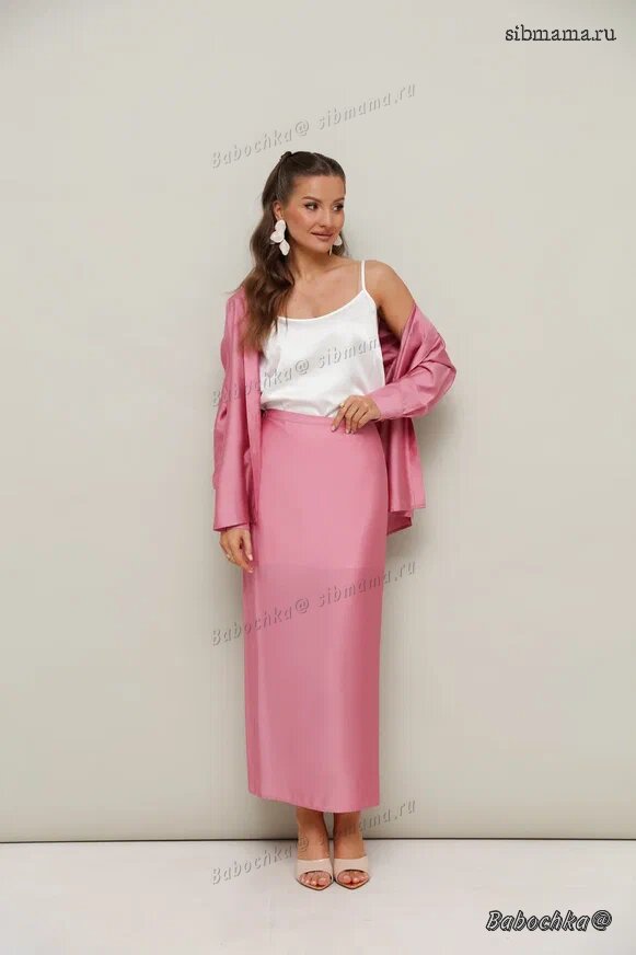 Элегантный 3-предментный комплект, состоящий из топа, блузки и юбки. Топ полуприлегающего силуэта, выполнен из струящейся ткани с матовым блеском. Бретели регулируются по длине. Блузка и юбка, выполнены из вискозного полотна. Блузка прямого кроя, горловина с рубашечным воротником на отрезной стойке, центральная застежка на петли и обтяжные пуговицы. Рукава втачные с манжетами с застежкой на пуговицы. В боковых швах обработаны разрезы. Спинка с отрезной кокеткой и встречной складкой. Юбка на подкладке в длине миди. Притачной пояс с частичной резинкой для регуляции по талии. Застежка в среднем шве по спинке на пуговицу и потайную молнию. Для удобства движения сзади обработана шлица. В комплекте прилагается пояс основной ткани.
