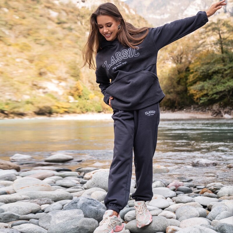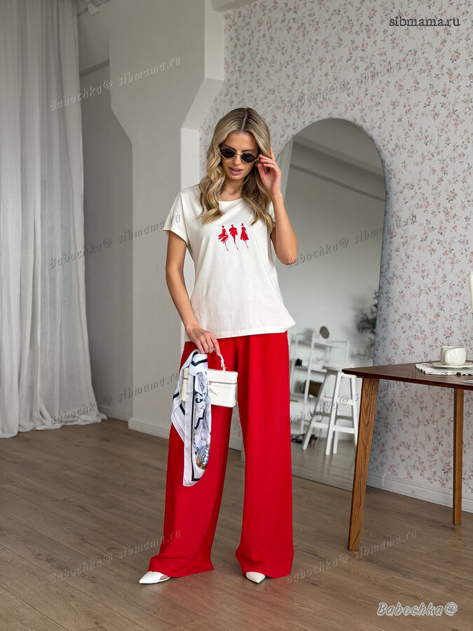 Брюки прямого широкого силуэта. По ПП брюк обработаны косые боковые карманы. Брюки обработаны поясом с резинкой.