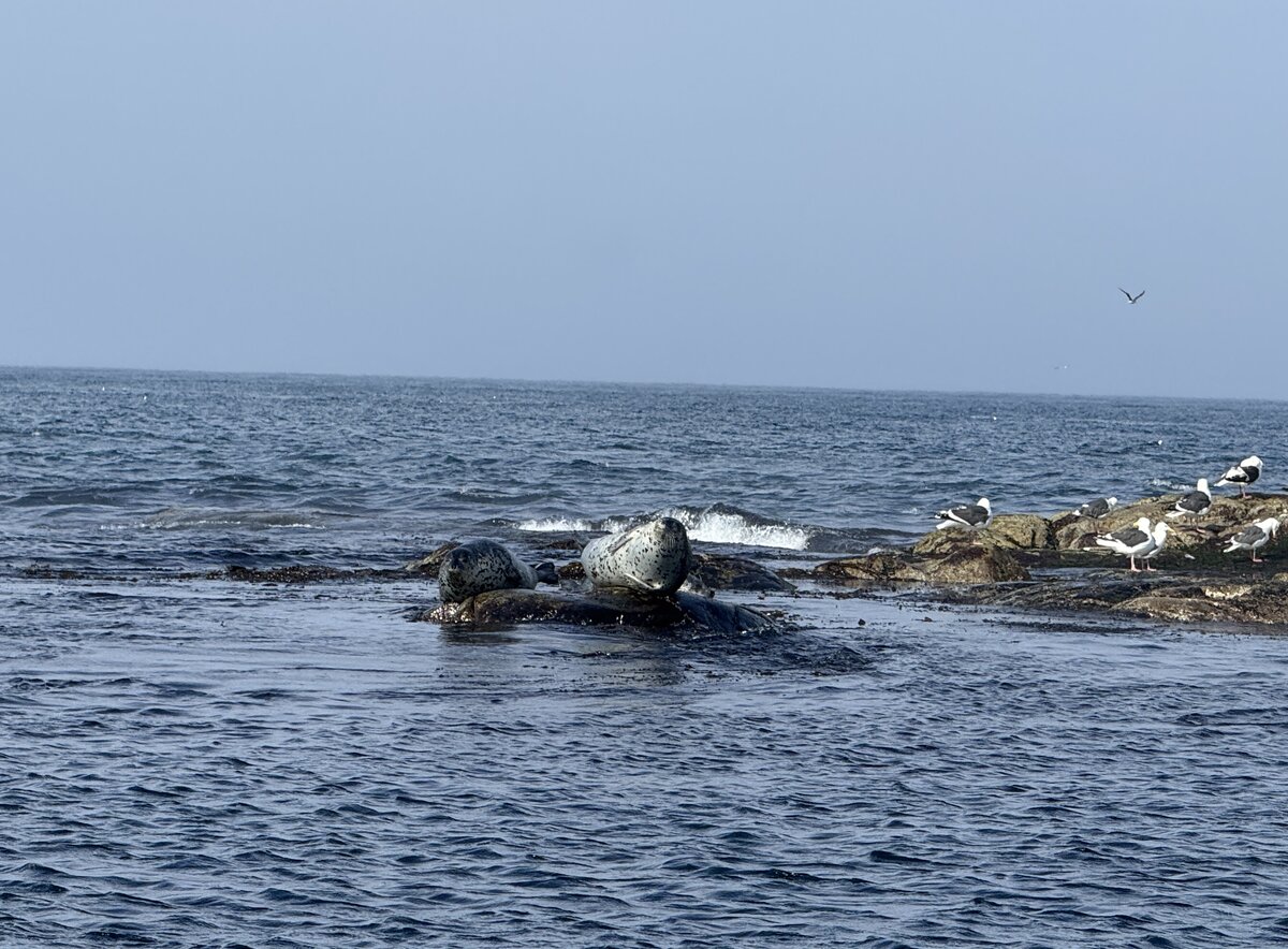 Наш капитан куда-то утопал за край бухты, а потом вернулся и начал нас звать. Оказалось, что «за углом» была тусовка нерп, штук 30-40, которые ужасно смешно занимались синхронным плаванием и художественной гимнасткой