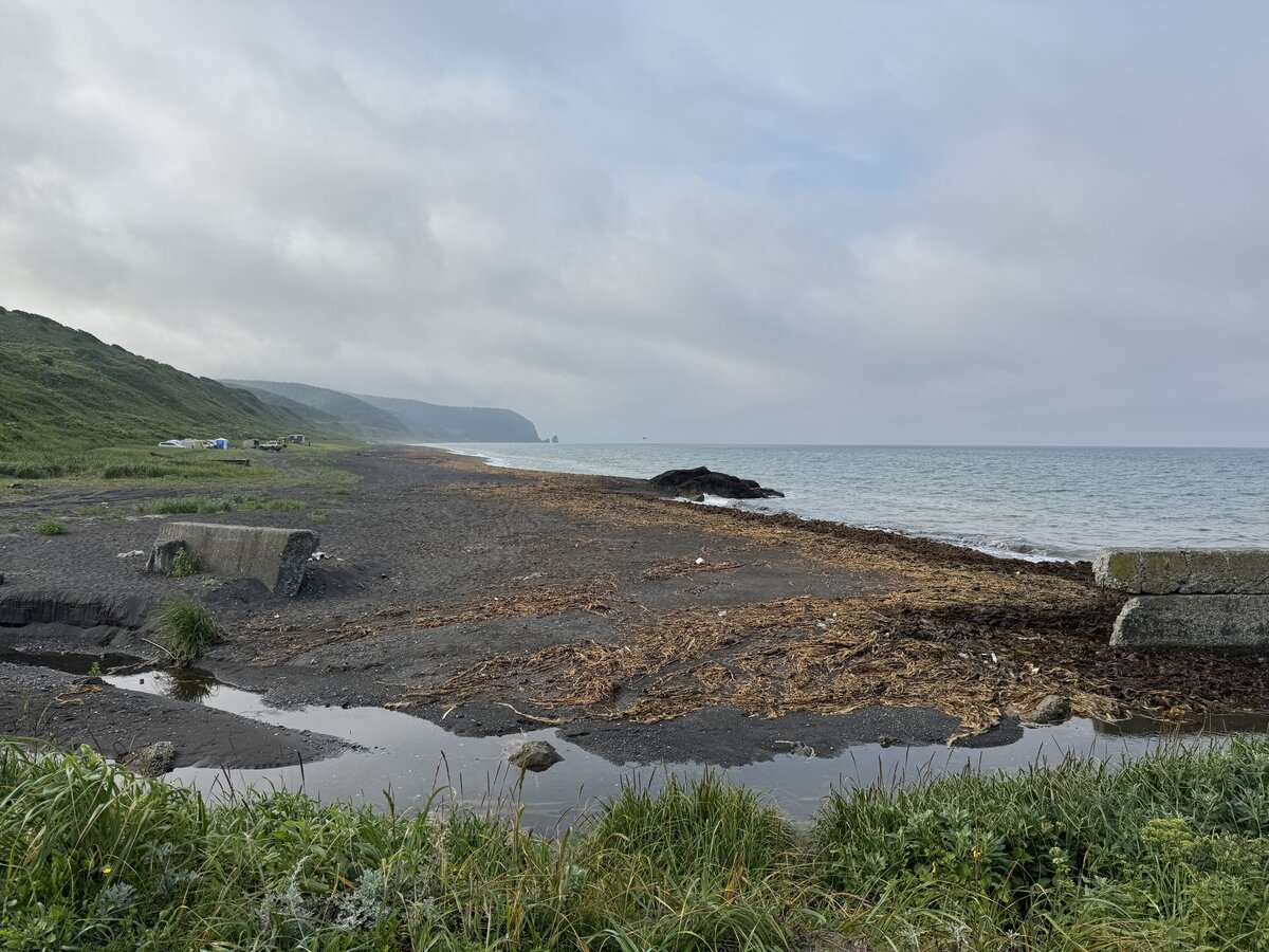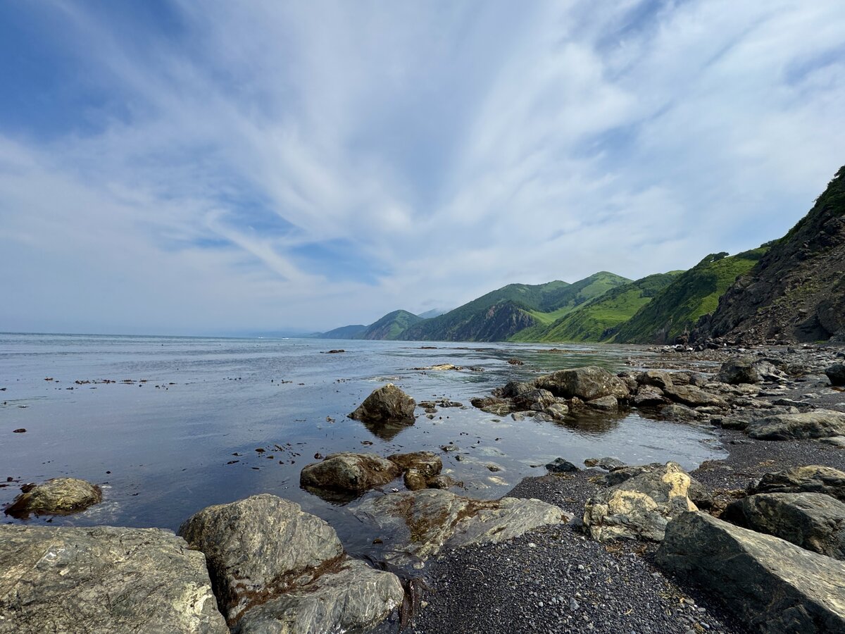 В бухте можно было купаться, температура воды была приемлемой, градусов 20-21 по ощущениям. Это в Анивском заливе уже. Но в сторону выхода в Охотское море.