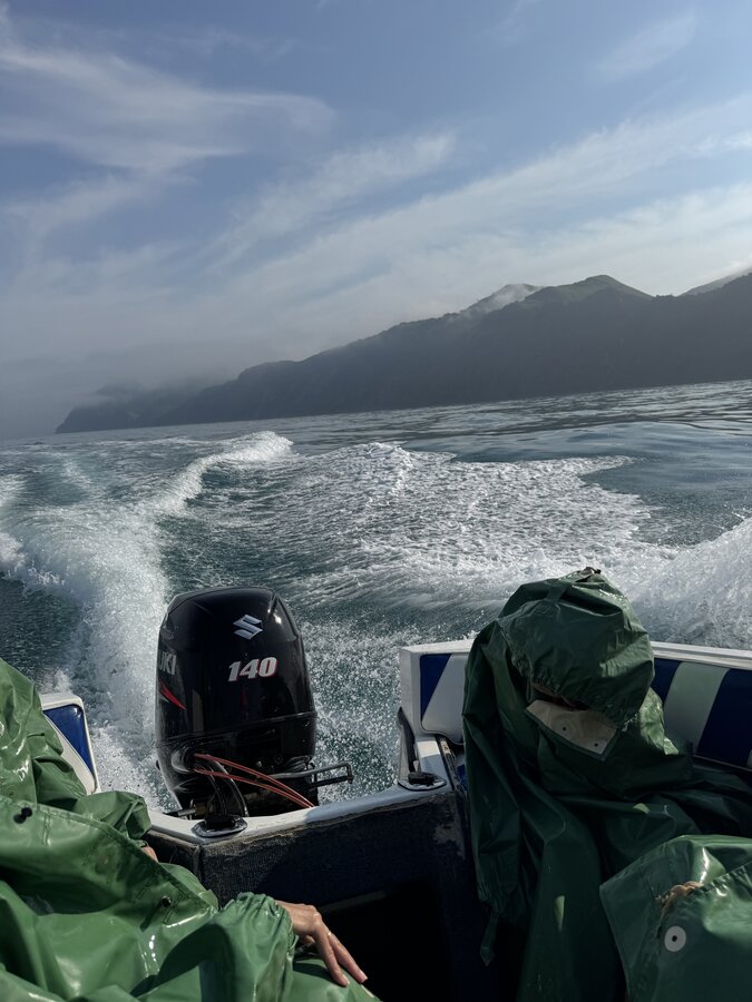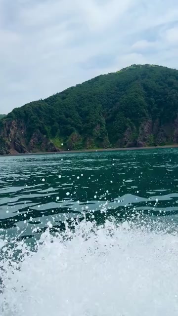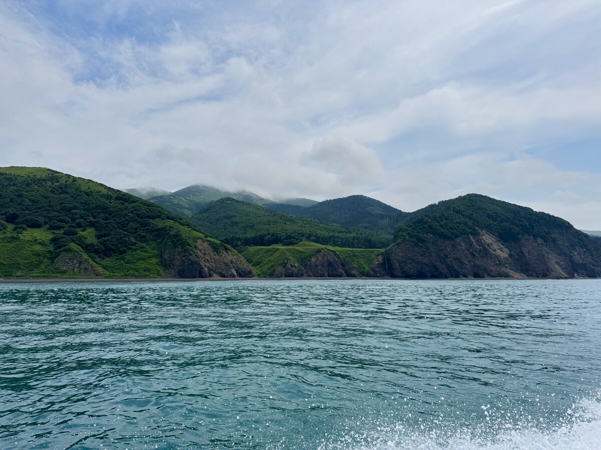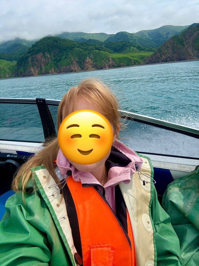 Но… ничего не бывает абсолютно плохо. Через 15 минут этого безобразия капитан предложил управлять мне катером и жизнь стала интереснее))) курс надо было держать на край географии, где заканчивается Сахалин. Это было интересно, но тяжело физически из-за волн. Потом нам встретилась первая 2,5м сельдевая акула, которая резвилась, выпрыгивая из воды. Капитан сказал, что это она дурит, обычно они так не делают. Похожа немного на дельфина в прыжках. Фото, конечно, нет, тк успеть было невозможно, телефон доставался из-под плаща долго.