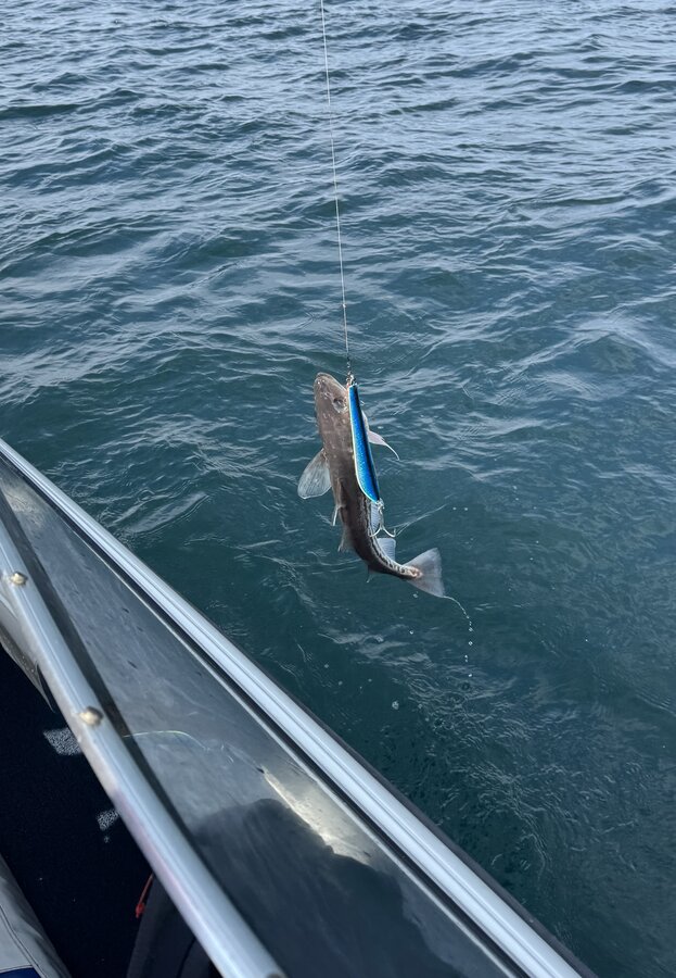 А дальше бонусом нашей экскурсии была рыбалка. Она не входит в стандартный пакет и была нашим персональным допом вместо выхода на камни. Так то рыбалка стоит по 5тр сверху на человека. Причем реально персональным, потому что дети на спиннинг не рыбачили, а взрослых было всего 5 человек, двоим из которых было не интересно. Короче бы начали ловит терпуга) и довольно быстро наловили огромных рыбин, что забрали потом с собой. Не так то просто было их вытащить, потому что глубина моря в этом месте была от 40 до 50м, а забрасывать надо было до дна и потом обратно столько крутить, а рыба большая и сильная. Рыбалка была, кстати, уже не в Анивском заливе, а в Охотском море - мы вышли чуть дальше за маяк, где уже могли быть пограничники. Вдали виднелись не большие корабли, не факт, что российские. В этом месте вы встретили еще одну акулу. Она уже по классике плавала с плавником из воды, и выглядела из-за этого более сурово. После нее рыба перестала ловиться, связано это или нет, не знаю.