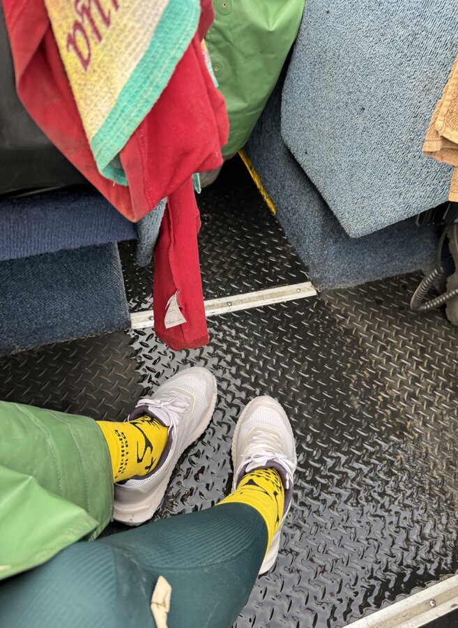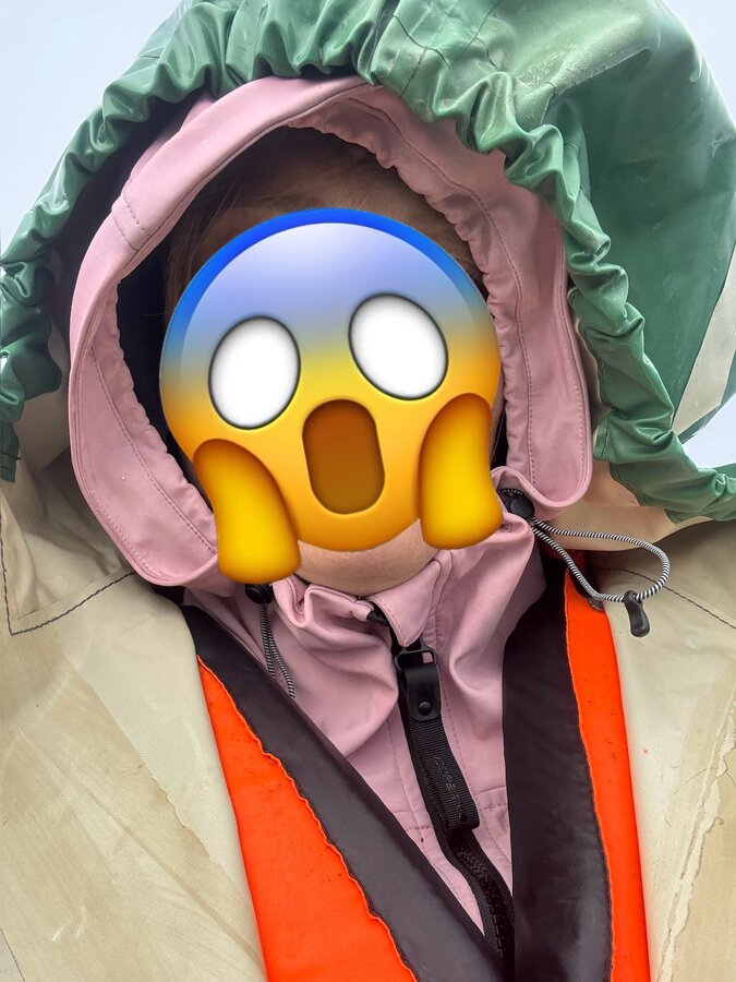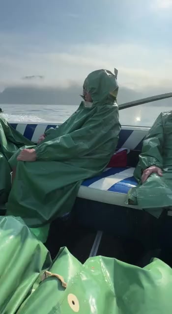 Мы, как «четкие ребята» взяли с собой ветрозащитные куртки, начитавшись отзывов о том, что выдаваемые плащи не герметичны и в них потеешь, взяли резиновые бахилы на кроссовки (от сапог нас отговорили, и слава богу, они бы утонули через верх), взяли шапки на головы, чтобы не дуло уши, взяли сменную одежду на случай жары/холода или промокания, лично я и шорты и доп штаны,взяли гидрочехол на рюкзак от дождя, я, правда, взяла еще свою сумку со своими вещами, чтобы не грузить ими мужа при доставании чего/то из нее и положила в нос катера за защитное стекло, как самая умная… и… через уже минуту после отплытия от пирса мы стали мокрыми … потому что нас тут же накрыло встречной водой от волны с головой. Никто не ожидал такого, ведь дождя не было, отличная погода была, и никто не замотался в этот резиновый плащ казенный, надетый поверх ветро и влагозащитных курток, все сидели с телефонами в руках и снимали пирс, шапка моя промокла абсолютно от первой же волны, и ее пришлось снять. В катер на дно хлынула вода, в которую упала моя сумка тканевая с запасными вещами Но , да, резиновые бахилы спасли кроссовки Вода также налилась на сиденье под зад, из-под которого я вытащила резиновый плащ, ведь жарко же на резине такой сидеть. И, короче, в голове проносились маты один за другим и мысль, КАК ехать мокрой полностью от булок до щиколоток до маяка больше 1,5ч!? как я думала тогда. Слава богу, вода залившаяся под плащ не намочила тело, тк там была вторая куртка, потому что остальные вещи уже «утонули» в моей сумке (но потом выяснилось, что выжили шорты). И захлестывало через борт просто бесконечно, по нам просто без остановки текла вода. Я иногда со смеху это фиксировала на телефон, который также покупался в воде, как раз на видео прилетело в него. Семья с детьми напротив нас была в ужасе. Особенно дети. Они все были одеты и обуты как попало. Было 8 утра и 18-19 градусов при значительном ветре. Мокрым плыть такое себе. Ребенка младшего трясло через час так, что страшно смотреть. Можно было б, конечно, избежать такого промокания, если б капитан сказал нам все укутаться по самое не хочу, но сказано было «накинуть плащи», мы и накинули. А надо было муроваться в сверток.