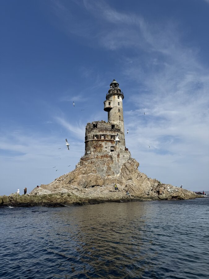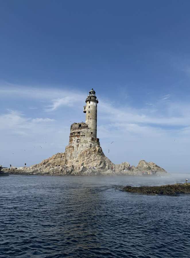 Лодка наша по факту оказалась катером, что и плюс и минус. Да, он шел ровнее по воде и быстрее, то есть до маяка мы дошли уже через час 10 (а резиновая идет где-то час 40). Но выйти на камни маяка с катера нельзя. Я и не собиралась, потому что не интересно было сразу, и, если честно, это абсолютно засранные камни чайками, вонь от которых начинается еще до того, как ты приблизился к маяку, а выходят туда и хватаясь руками и вообще… ну, такое себе. Смотреть на него, в общем, лучше с расстояния. Да и смотреть не сказать, чтобы было, что))) совершенно плачевный вид разваливающегося маяка, когда-то очень красивого и величественного на краю географии. Ощущение, что с него до Японии рукой подать. И с одной стороны, ты поражаешься тому, что в такой дали и в море есть это строение, что в нем находились люди, в совершенно диком и оторванном от цивилизации месте, с другой стороны, как локация за 7500₽, ну… камон? Кто-то слишком много кушать… до кучи сейчас расскажу, КАК началось это путешествие)))