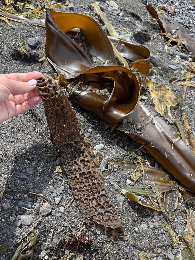 Тут же в море можно собрать и еды, если покопаться в водорослях морской виноград у меня в руке, что интересно, совершенно другой, чем тот, что только что ели во Вьетнаме. Этот жарят перед едой, но я попробовала прям вытащив из моря, солененький к слову сказать, на обед у нас были дары местной кухни - уха из свежейшей горбуши, этот самый виноград и всякие местные закуски и напитки из клоповки