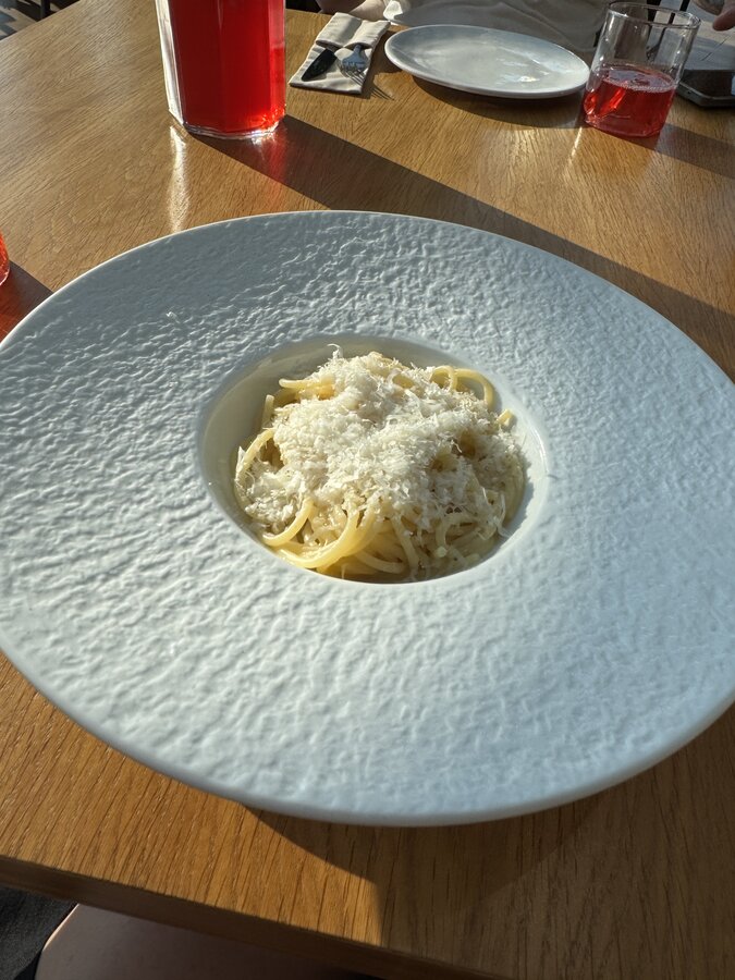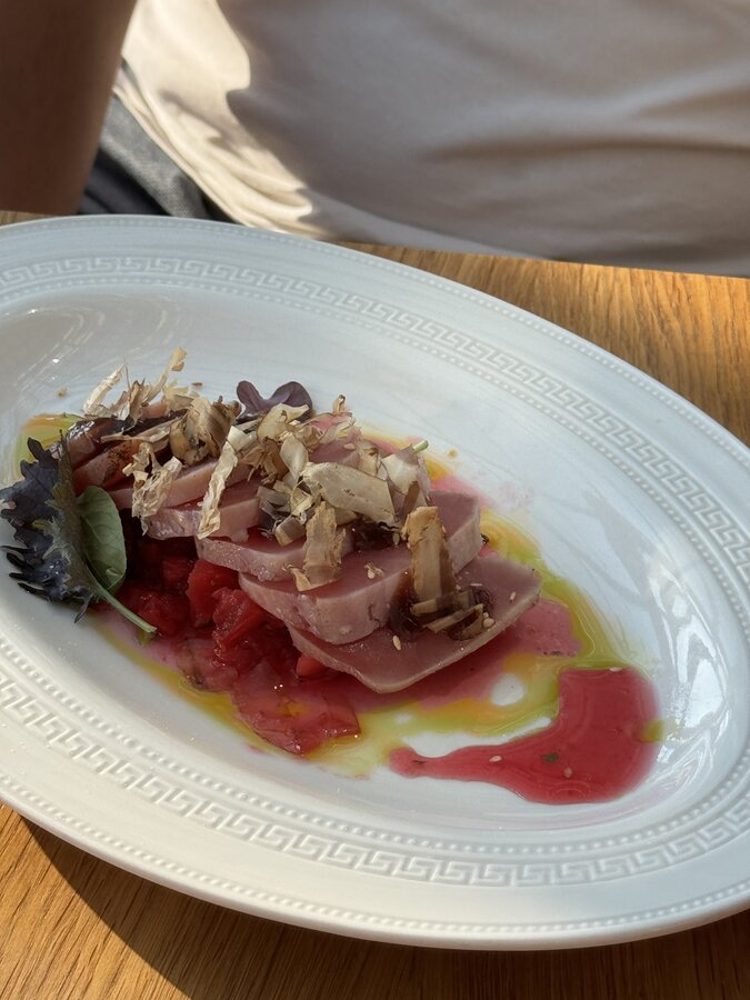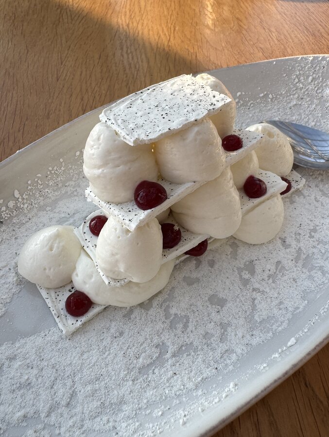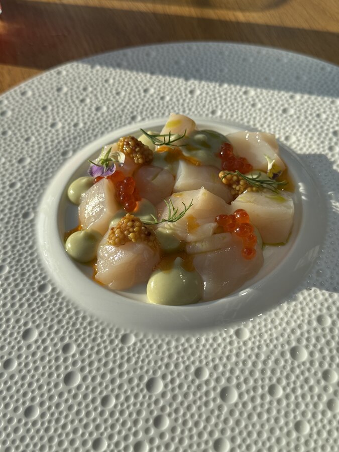 Очень разнообразным меню морепродуктов и красивой подачей, а также очень красивой посудой. Не стала фотать всю, а то было уже не удобно по еде нам все понравилось, кроме моего десерта. Все-таки это никакая не Павлова и вообще не соответствует ценнику ни разу (а ценник в этом ресторане злой, злее всех предыдущих. За соседним столиком, наверное, какие-то олигархи назаказывали тысяч на 50-70 некоторые «тарелки» им выносили вдвоем, потому что вес самой тарелки на вид кг 3-5 )