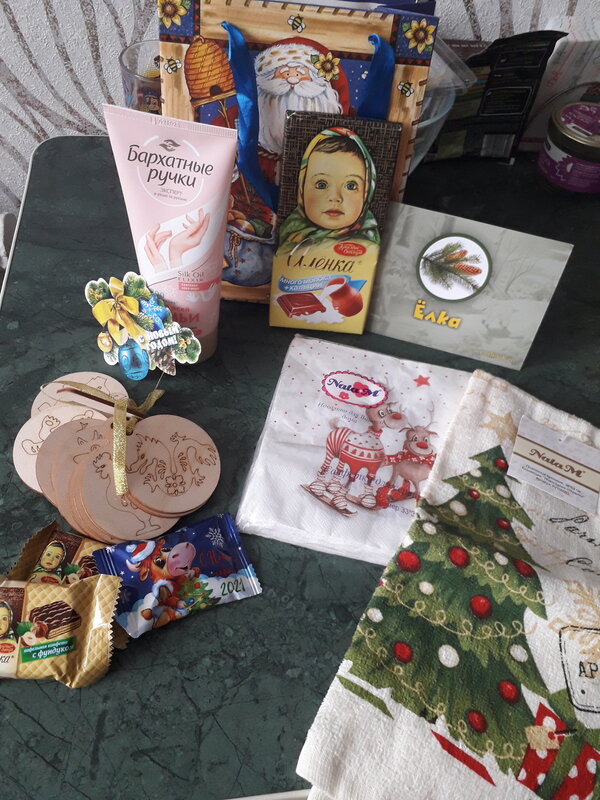 Подарочек красивый, весь новогодний, нам в горном сегодня елку наряжать, а игрушек нет, и эти деревянные шарики будут так кстати!!! Полотенчик, конфетки, крем, все пригодится и напомнит о волшебстве праздника весь год!!!