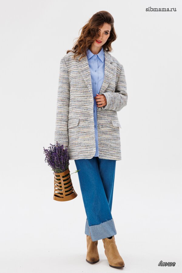 ПЭ - 100%" "Жакет выполнен из меланжевой костюмной ткани букле. Жакет прямого силуэта, кроя oversize, длиной ниже линии бедра. Спереди карманы с клапанами, бортовая застежка на две пуговицы. Жакет по спинке со средним швом со шлицей. Воротник пиджачного типа. Плечевой шов удлинен. Рукав втачного покроя, двухшовный. Жакет на притачной по низу подкладке.