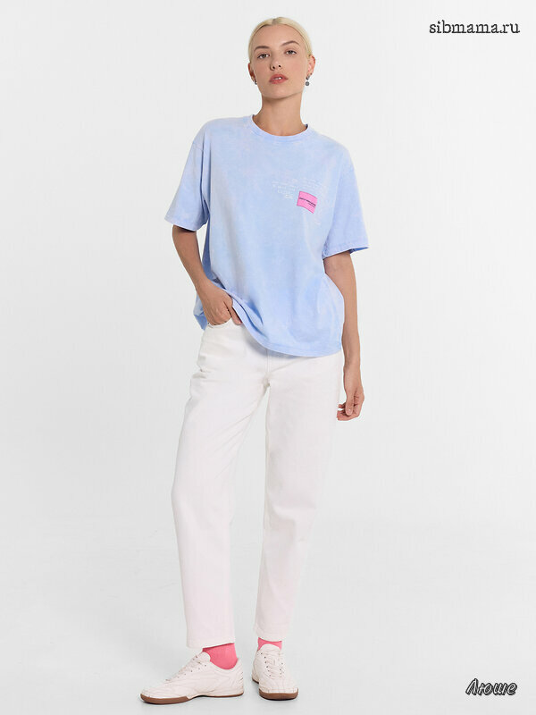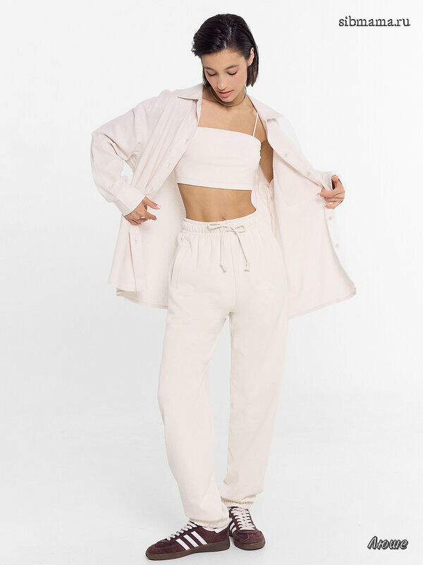 Комплект женский из трикотажного полотна кулирка. Джемпер свободного силуэта из трикотажного полотна кулирка 100хл. Горловина круглой формы, обтачка горловины из рибаны 1*1. Шов горловины спинки закрыт бейкой из кулирки 100хл. Плечо спущено, пройма углублена, рукав втачной удлиненный. По плечу и пройме проложены отделочные строчки. Джемпер удлинен, с разрезами в боковых швах. Шорты прилегающего силуэта из трикотажного полотна кулирка хл/эл. Пояс отрезной, широкий, по сгибу с эластичной тесьмой. Шорты без бокового шва. Длина шорт выше колена.