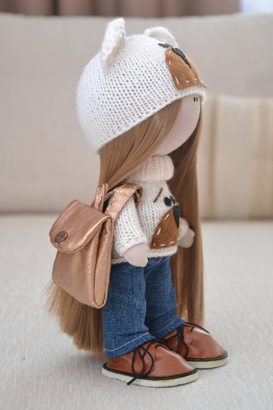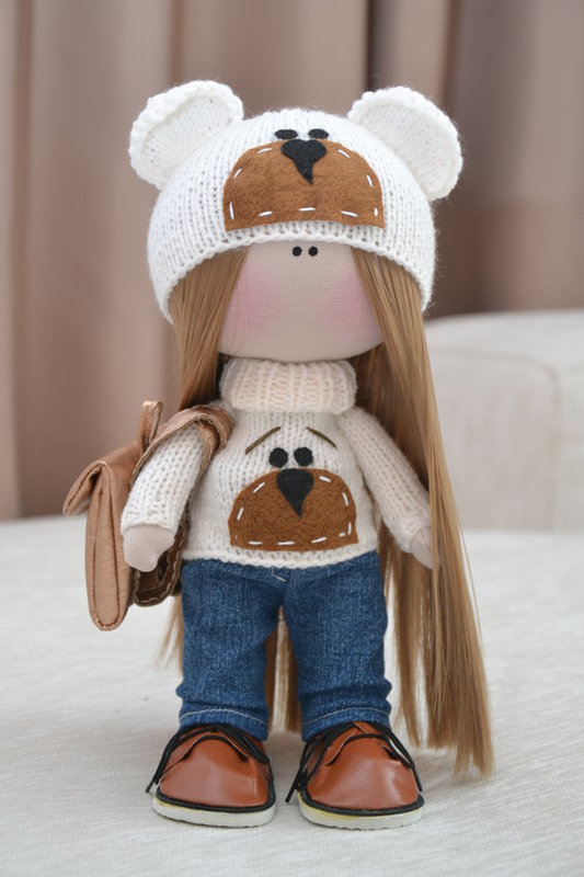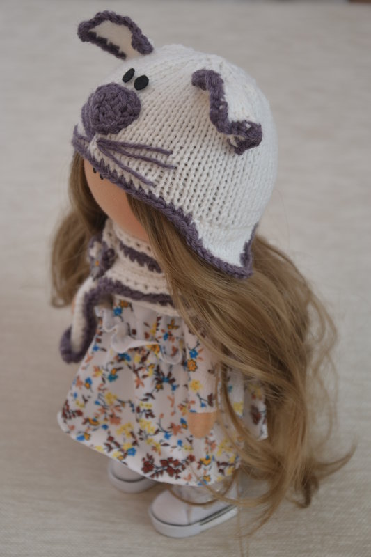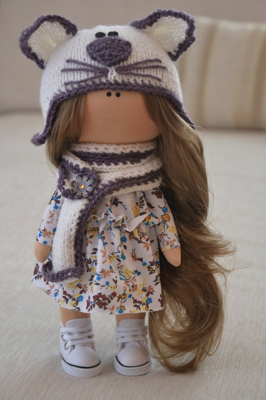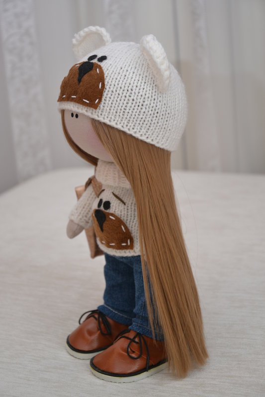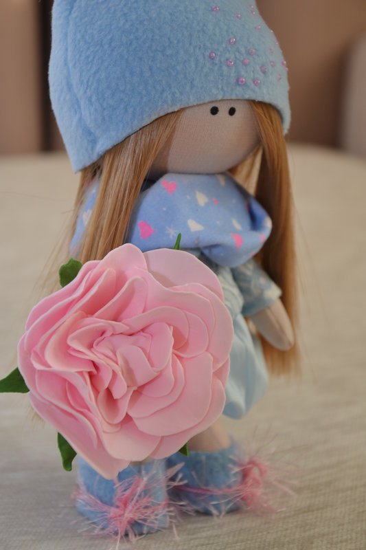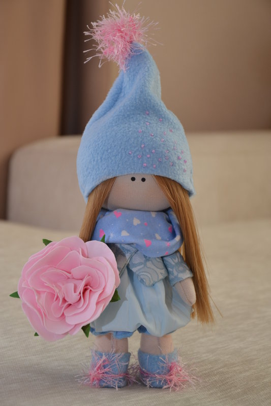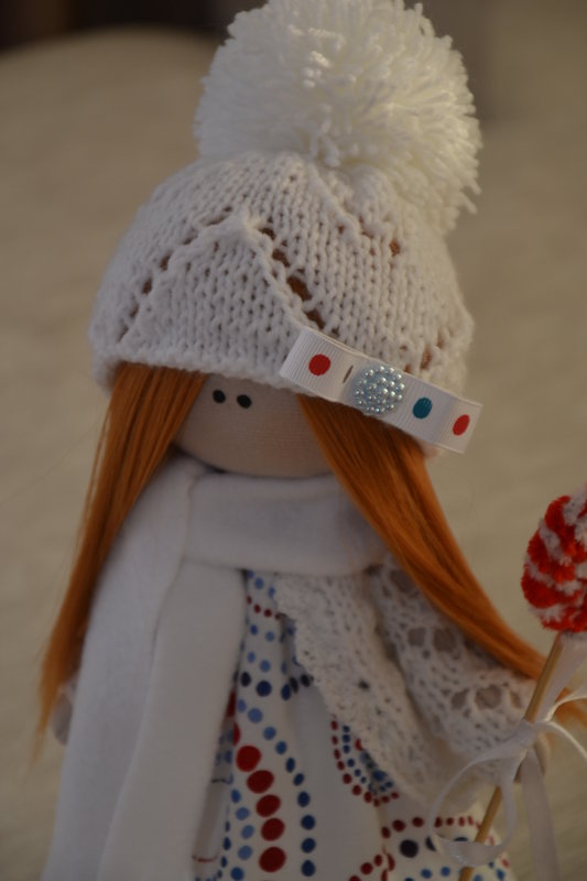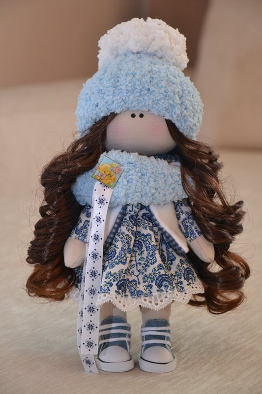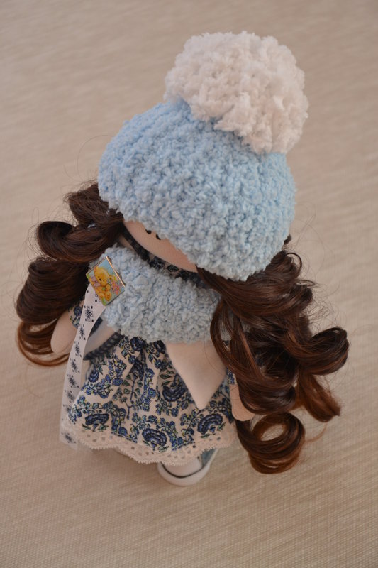 Малышка Гжелька. Розовые от мороза щёчки, шикарная шевелюра, тепленькая шапочка. Очень милая и уютная куколка получилась.