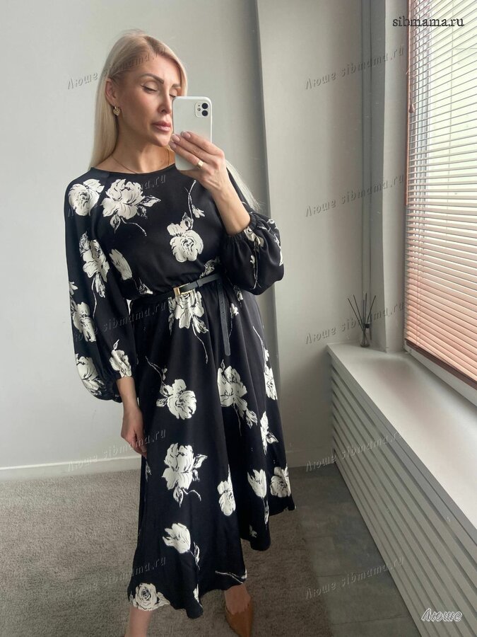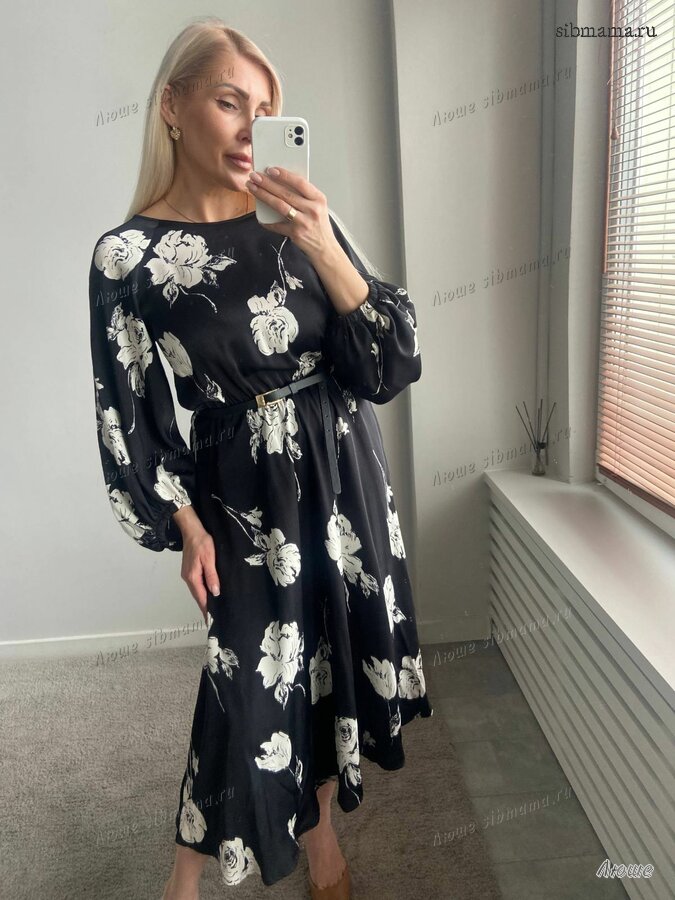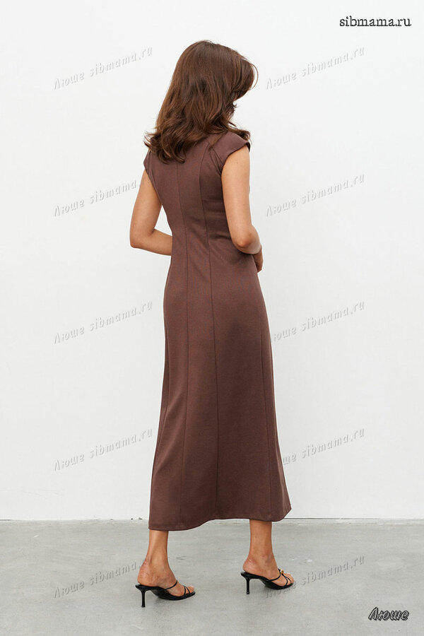 Платье из трикотажного полотна прилегающего силуэта с коротким, втачным рукавом. Длина платья выше колена. Перед изделия задекорирован мягкой драпировкой в области талии с декоративной металлической пряжкой. Сзади разрез и застёжка на потайную молнию.