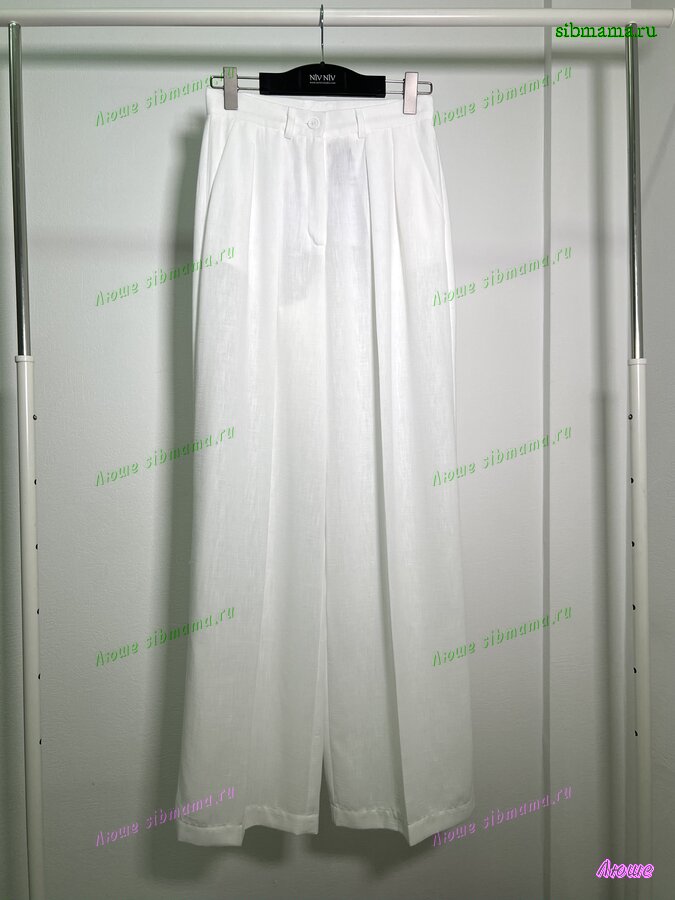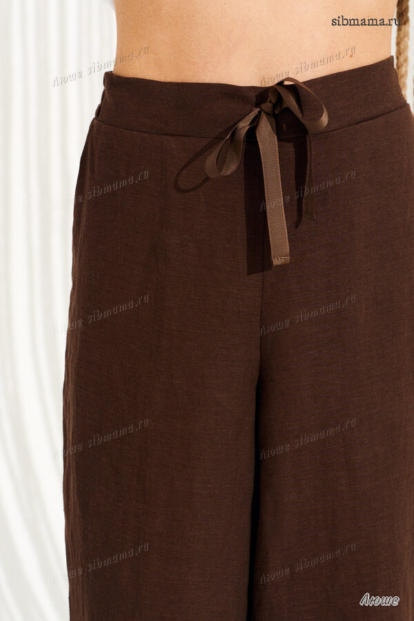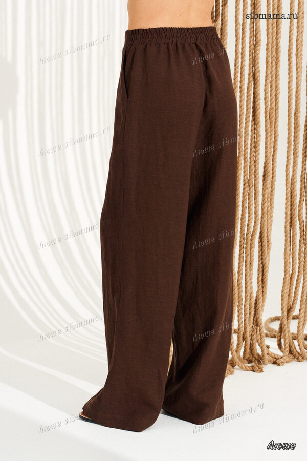 2384 брюки женские 25294-2003 коричневый 42-54 53% лен, 47% вискоза Брюки умеренного объема, прямого силуэта. На передних половинках выполнены боковые карманы с отрезным бочком. Пояс притачной, с резинкой по спинке и петлями по переду, в которые продета декоративная тесьма. Длина изделия на модели вдоль бокового шва с учетом пояса — 110,5 см (допустимое отклонение +/- 1 см)