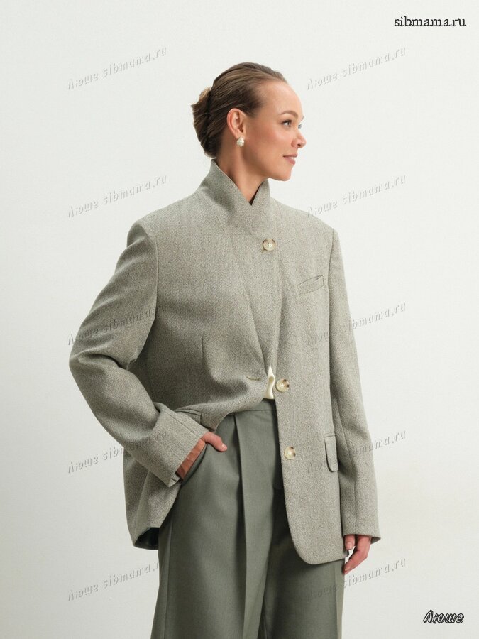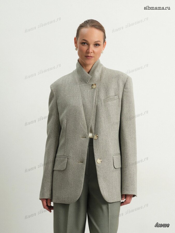 Детали | Смещённая застёжка с длинным рукавом, воротником и лацканами. На верхней половинке рукава шов, внизу рукава шлица. На подкладке с застежкой на две пуговицы. Жакет без карманов. На полочке и спинке застроченные складки подчёркивают приталенный силуэт.