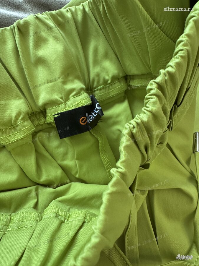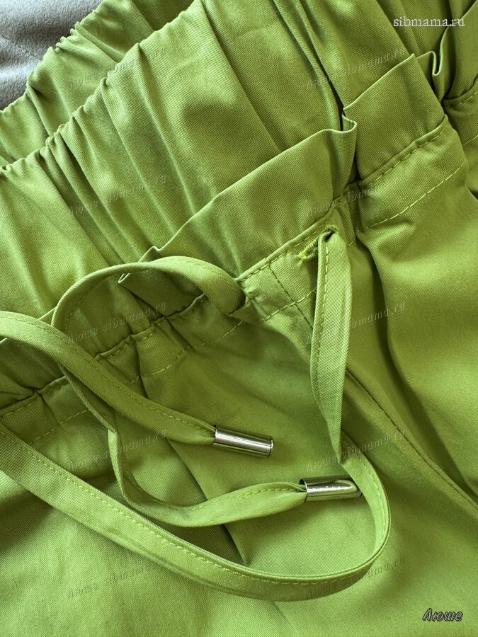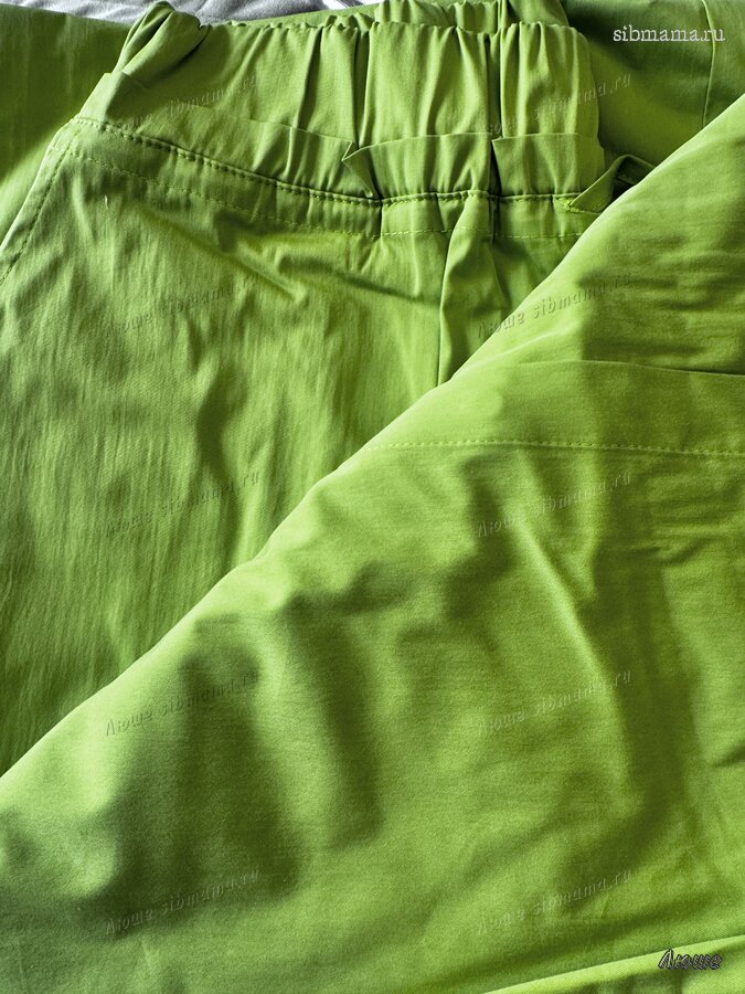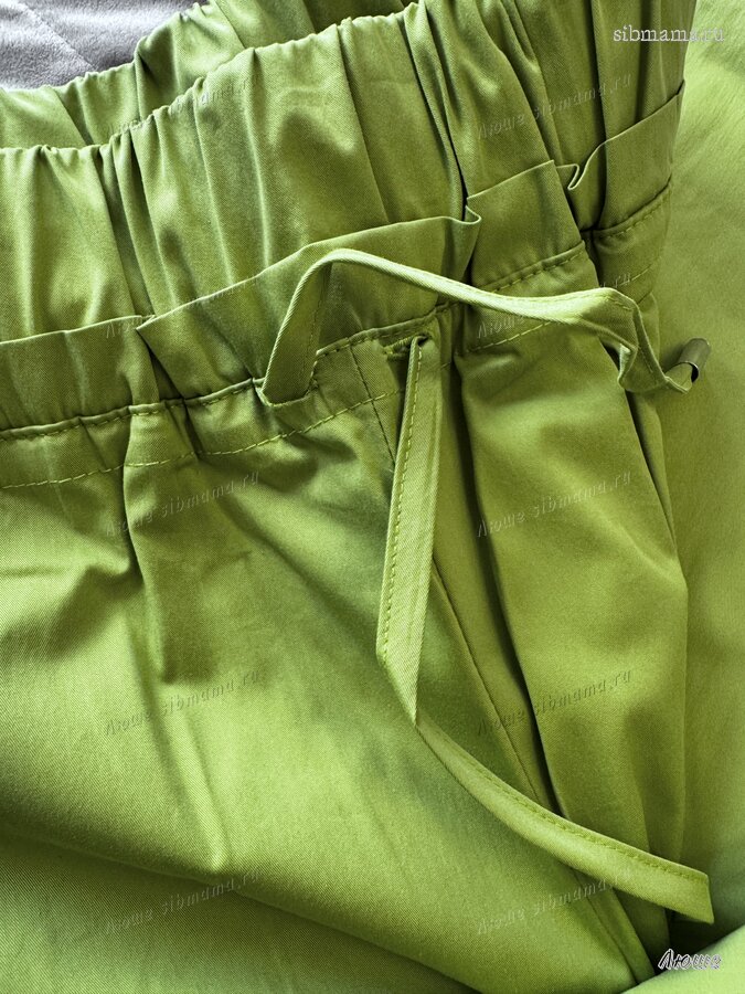 15342 комплект женский 2-х предметный (блузка + брюки) 25294-2003 лайм 44-54 55% хлопок, 40% ПА, 5% спандекс Костюм 2-х предметный, состоящий из блузки и брюк. Блузка свободного объема, прямого силуэта, с центральной застежкой на петли и пуговицы. Воротник-стойка. Линия талии оформлена кулиской с поясками и фиксаторами для регулировки прилегания. Детали переда с накладными карманами и клапанами. Спинка цельная. Рукав втачной, короткий. Брюки умеренного объема, прямого силуэта. На передних половинках выполнены боковые карманы с отрезным бочком. Верхний срез брюк оформлен кулиской, в которую продет шнур-завязка. Пояс притачной, на резинке, оформлен рюшей. Длина блузки на модели вдоль середины спинки — 73 см, длина брюк на модели вдоль бокового шва с учетом пояса — 118 см (допустимое отклонение +/- 1 см)