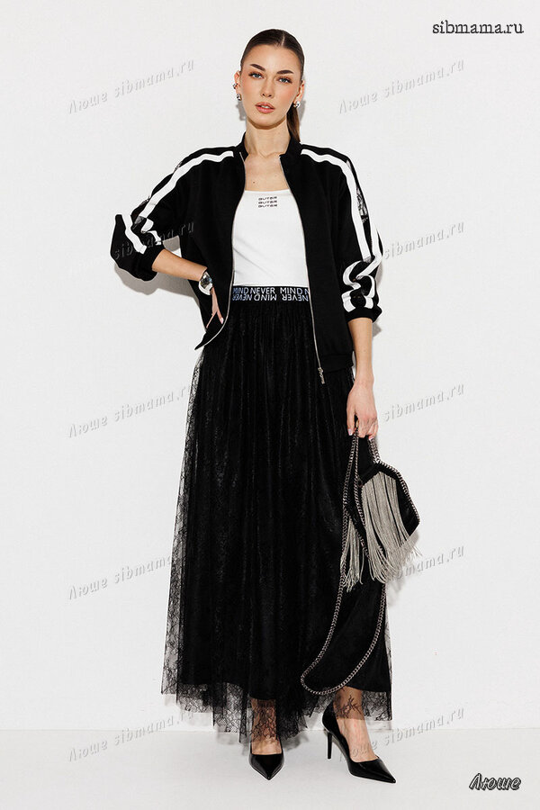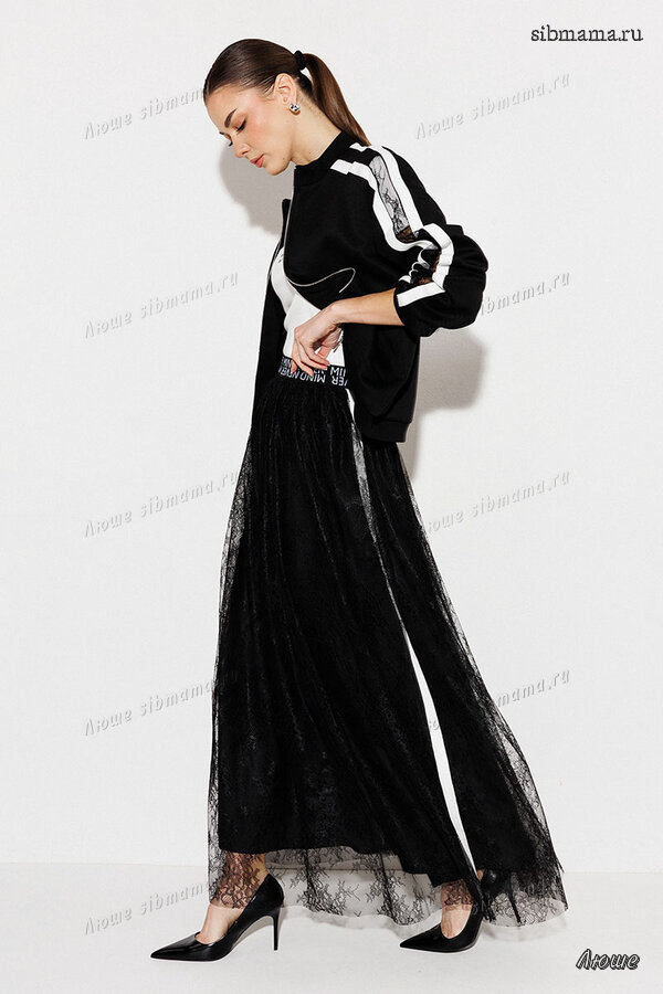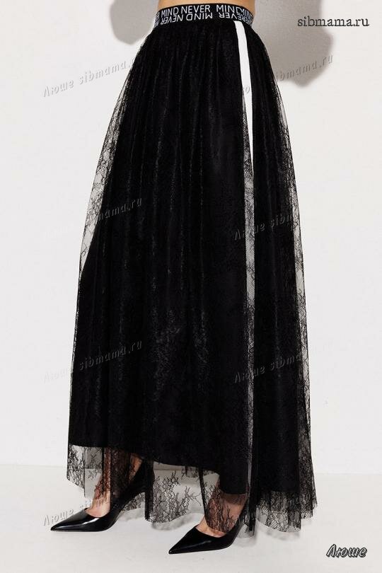 3278 100% ПЭ Юбка 3900 42-54 170 черный Юбка длинная А-силуэта из кружева на подкладке. Пояс из декоративной резинки со шрифтовой композицией. По бокам лампасы