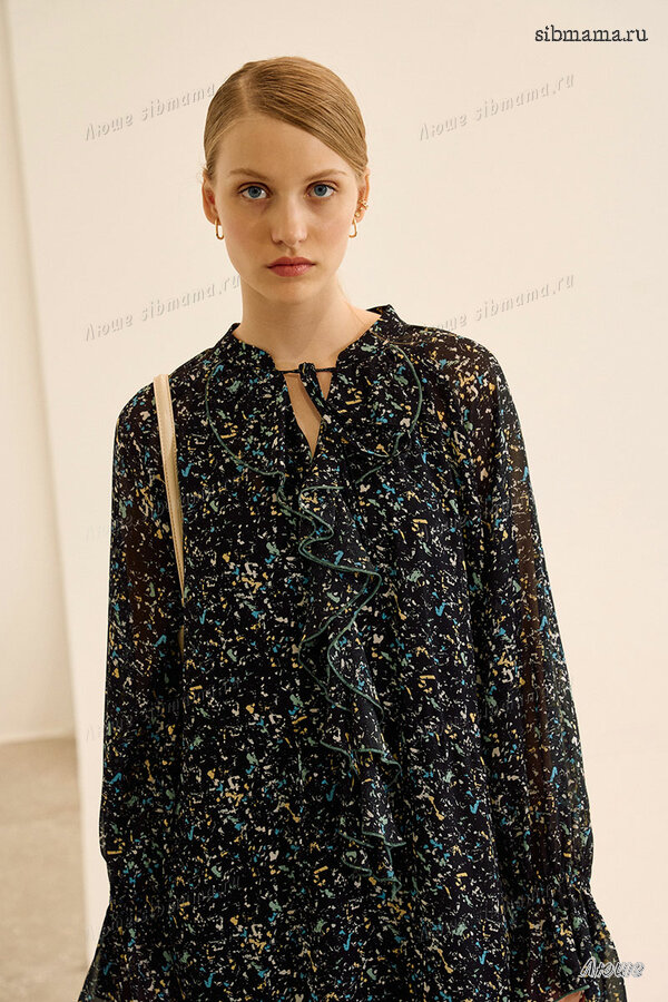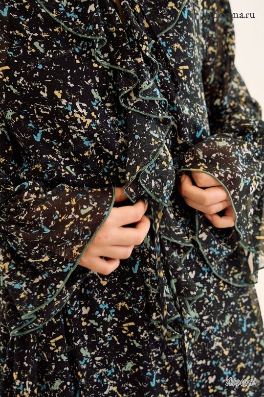 Платье свободного кроя, выполнено из шифона. Рукав длинный реглан, по низу рукава резинка. Глубокий V-образный вырез горловины, в который вставлена рюша, по горловине стойка на завязку, по середине выреза застежка на навесной потайной крючок. По линии талии по переду и спинке кулиса на завязку, по низу платья притачной волан. В комплект входит платье-комбинация из трикотажной подкладки на бретелях.