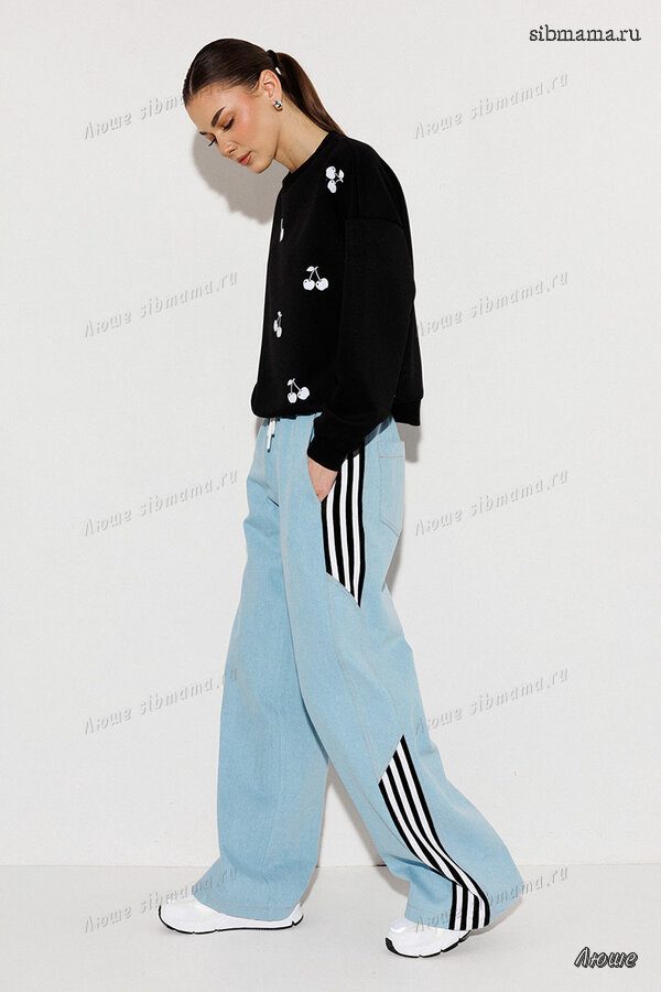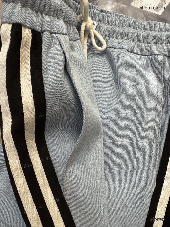 Брюки-джинсы, комбинированные, прямого силуэта. На притачном отстроченном поясе с втянутым в него декоративным шнурком. Перед и спинка выполнены из джинса. По переду карманы в шве с наклонным входом. По спинке накладные карманы с нашивкой "BUTER". По бокам отрезной бочок, комбинированный из замшевой отделочной ткани, по которой отстрочено 3 узких лампаса и центральная вставка из джинса.