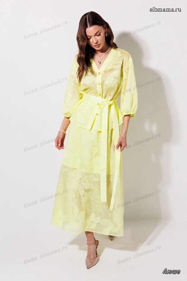 Костюм 4365 5490,00 44-54 "Комплект, состоящий из блузки и юбки из полупрозрачной натуральной ткани с вышивкой. Блузка свободного силуэта со слегка спущенной линией плеч. Горловина V-образная с центральной застежкой на пуговицы. Рукав свободный со сборкой на резинку по низу.