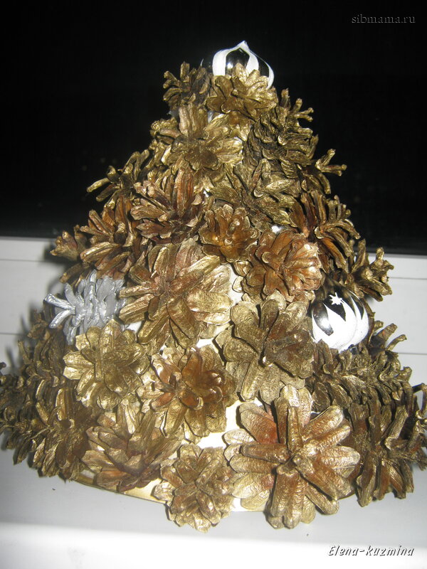 В основе картонный конус. Сосновые шишки (специально собранные) - покрашены бронзовой краской + елочные игрушки