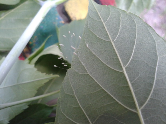 Про кладку яиц: недавно увидела что-то очень интересное- с обратной стороны листа на тонких ножках -ниточках длиной примерно 0,5 см яички. Сначала подумала, что это растение паразит. Потом решила что это кладка яиц какой-нибудь букашки. Сейчас фото покажу.