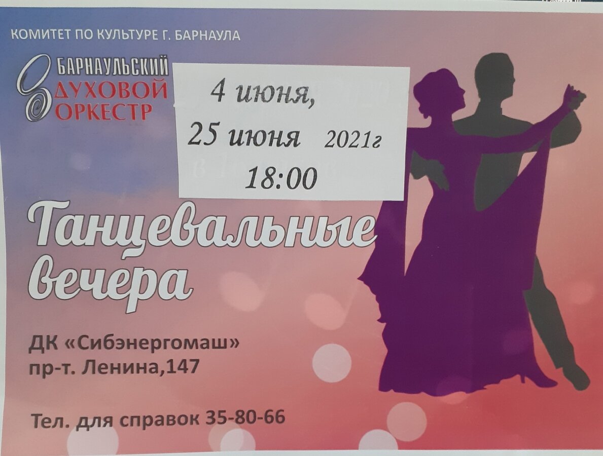25 июня – Танцевальный вечер. ДК «Сибэнергомаш», пр. Ленина, 147 - 18:00 часов Стоимость входного билета летом всего 50 рублей.