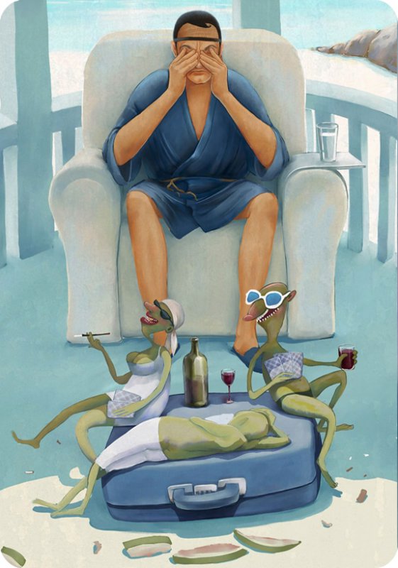 Деду какой шик валяться под нарисованными пальмами? И солнышко не греет, дедуля в валенках