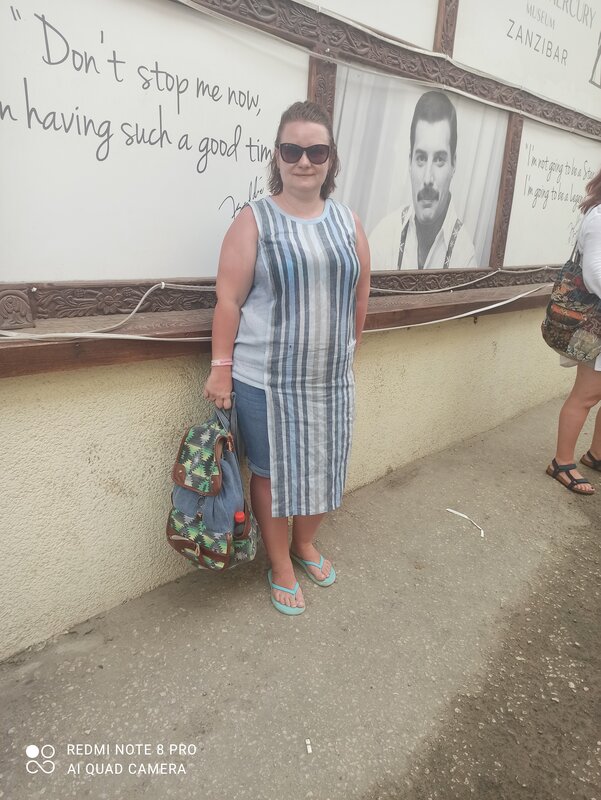 На мне платье полосатое fem///, легкое, комфортное очень, в размер (50).