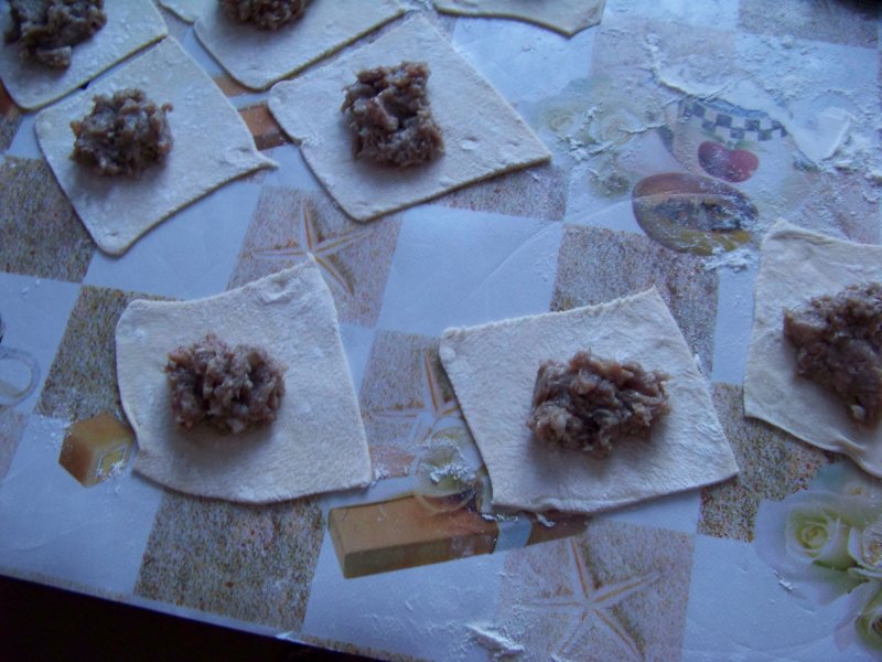 Раскатываем тесто подпыляя стол мукой, толщиной примерно 2 мм. Вырезаем круги, на середину каждого круга кладём фарш и защипываем.
