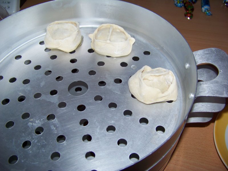 Пока закипает ставим манты на решётку. Обычно я каждый мант донышком макаю в растительное масло и ставлю на решётку, это чтобы не прилипало.