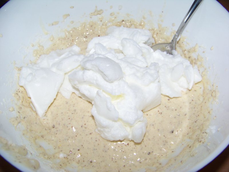 Взбиваем, добавляем муку и ложку белков, хорошо взбиваем. Затем добавляем оставшиеся белки и перемешиваем аккуратно ложкой.