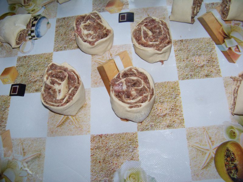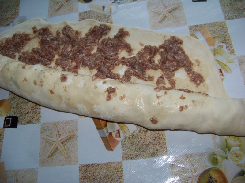 Тесто раскатываем на столе 2 мм толщиной примерно и намазываем на него фарш, заворачиваем в рулет.