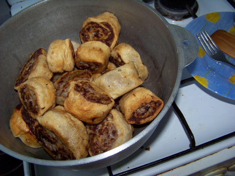 Когда обжаривается с двух сторон, получается коричневая корочка. И всё скрепляется крепко, даже при разогреве ничего не то что фарш не убегает, даже тесто не разлазиется. Они так и остаются такими как их сделали.