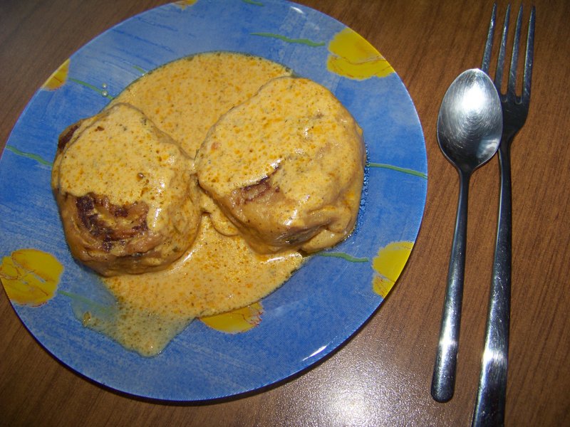 Соус: в произвольном количестве - сметана, немного кетчупа, перец чёрный, паприка, щипотка куркумы, соль, кориандр, петрушка сушеная, чуточку сахара, вода.