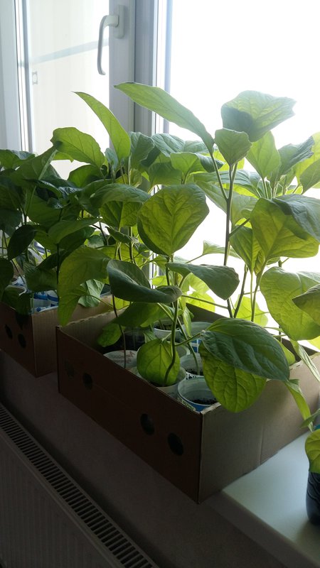 А вот у баклажан листья пожелтевшие, чем - то надо подкормить их. Высаживать буду в ОГ под дуги, т.е сидеть им дома еще 2,5 недели минимум.