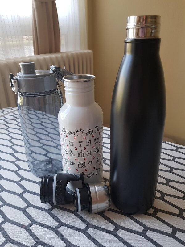 Наши баночки: пластиковая для воды, металлическая белая для воды и горячих напитков, но не термос. Последняя черная термос. Они не протекают, в принципе удобные.