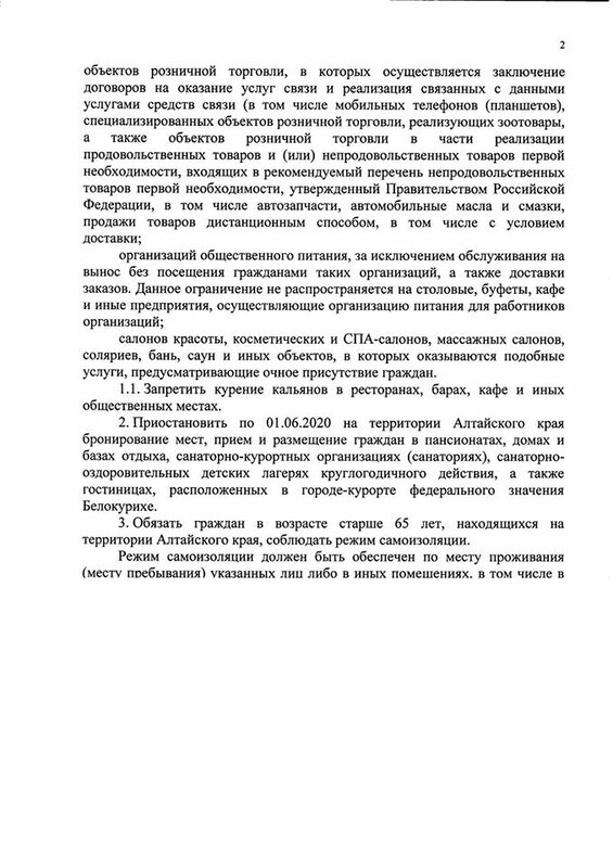 В период до 1 июня 2020 года приостанавливается бронирование мест, прием и размещение граждан в пансионатах, домах отдыха, санаторно-курортных организациях (санаториях), санаторно-оздоровительных детских лагерях круглогодичного действия и гостиницах, расположенных в городе-курорте федерального значения Белокурихе, а также в иных санаторно-курортных организациях (санаториях), санаторно-оздоровительных детских лагерях круглогодичного действия. Данное ограничение не распространяется на лиц, находящихся в служебных командировках или служебных поездках.