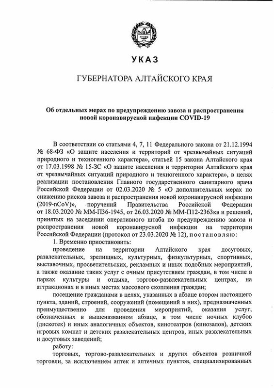 Губернатор Алтайского края Виктор Томенко утвердил новый указ о мерах по предупреждению завоза и распространения коронавирусной инфекции