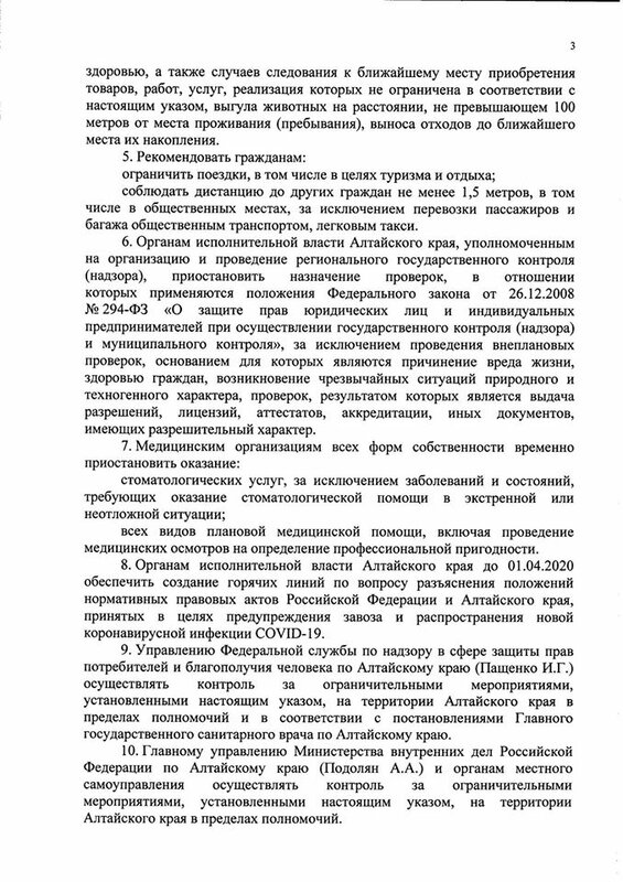 Управлению Федеральной службы по надзору в сфере защиты прав потребителей и благополучия человека по Алтайскому краю, Главному управлению Министерства внутренних дел Российской Федерации по Алтайскому краю и органам местного самоуправления предписано в пределах полномочий осуществлять на территории региона контроль за ограничительными мероприятиями, установленными настоящим указом.